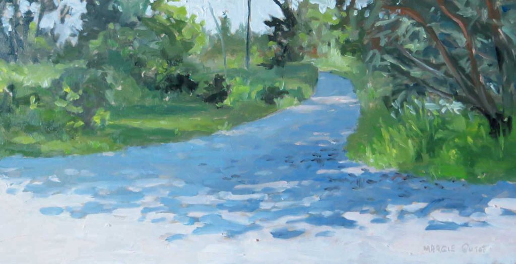 It was a beautiful day. I wanted to paint something. Definitely a landscape. But I didn’t want to actually go anywhere. Well, there’s always my driveway! In fact, the driveway was a major selling-point when I was house-hunting. “Find me a mailbox with a driveway that you figure a house must be back there somewhere!” is what I told the realtor. Ah, seclusion! I love it. I’ve painted it in all seasons, in all kinds of weather. Set up my Soltek in the shade and painted happily away with my little painting buddy, Picasso. A perfect day for an introvert! Some people go mad during self-isolation in this pandemic but to me, it’s just another quiet, pleasant day.
