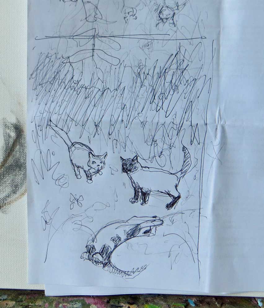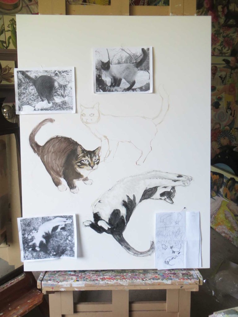 The day started with hoses. Days of 90 degrees here and no rain in sight! So mostly, I watered. But then I got the itch after lunch. Kitties! I wanted to do a painting with my 3 cats. Something so challenging, it would keep me occupied in my nice, cool studio. I rifled through my photos of my fur babies and found a few that I could use for reference. Began sketching them in this afternoon. Starting a painting is kind of like being an astronaut in a rocket, itching for takeoff! Let’s see how this one goes!
