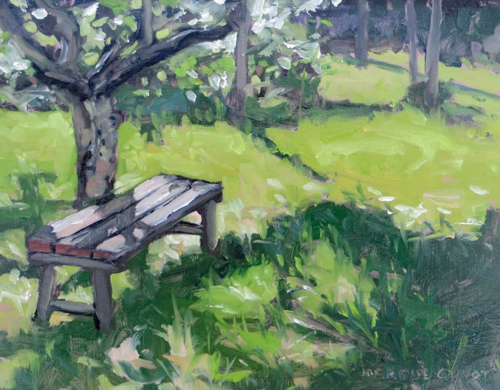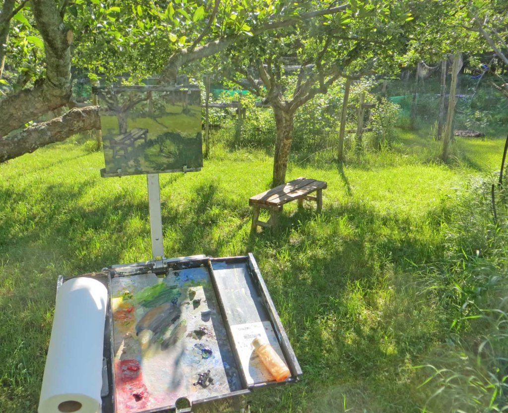 Last week I picked up an old wooden bench at an estate sale, thinking it’d be a nice place to sit out in my orchard. Well, ha ha — who has time to sit? Summer days are a mish-mosh of gardening, weeding, lawn care, laundry and (last but not least) painting. Originally I’d thought it’d be nice to sit on this bench and paint.