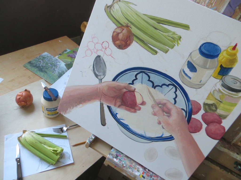 It was time to add some ingredients. Why I’d bought celery hearts last time, I don’t know. They were trimmed severely. Most uninspiring. So much better to have the long, sprawling ones, I think. So I mussed this bunch up a little. Turned a stalk askew. Also new today: a pickle jar, a few more potatoes, a Vidalia onion and the beginnings of a few hard-boiled eggs. And radishes! Yes, I like radishes in my potato salad. My Aunt Dorothy screeched at me Radishes? No! You don’t put radishes in potato salad! Alas, she was no gourmet. Iowa in the 60’s…sigh…..