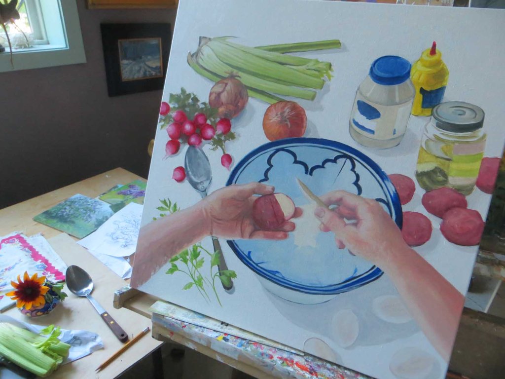 Not a lot of time to spend in the studio today. Too many errands. Driving hither and yon, schlepping artwork. When I finally got home I “invented” some radishes and another onion. Went out to the garden and got a sprig of parsley to add. Then I painted the background with white and Liquin (to help it dry quicker). Rifled through my vast tablecloth collection and found one with a bright pattern. Tomorrow will be a total loss for studio work. I’m participating in an art fair and a plein air paintout. What was I thinking????