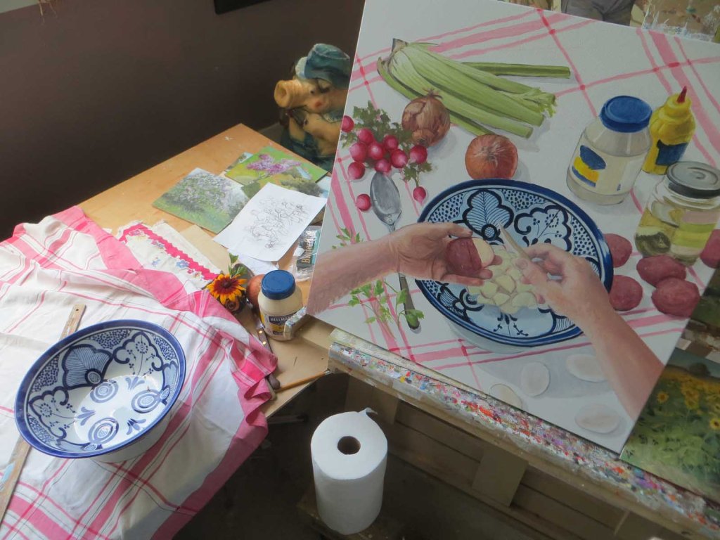 Kind of a busy day, beginning with hanging a bunch of paintings in an art fair booth over in East Jordan. From there I drove around for another three hours, stopping to do plein air landscape paintings before noon. Came home for lunch (2 hot dogs!), then remembered I had a load of laundry to do and there were green beans, zucchini and cherry tomatoes that needed to be picked. Turned on the sprinkler and returned to the studio to work on this still life. Two hours later I remembered the sprinkler. Then I zipped back to the art fair to put my paintings into the truck for the night. But was I done? Of course not. I swung by to one of my favorite plein air spots for a 4th quickie of the day. Dinner was a bowl of ice cream, followed by dessert: standing out in my blueberry patch in my nightgown, gobbling blueberries and calling the cats in for the night. The fun just never ends!