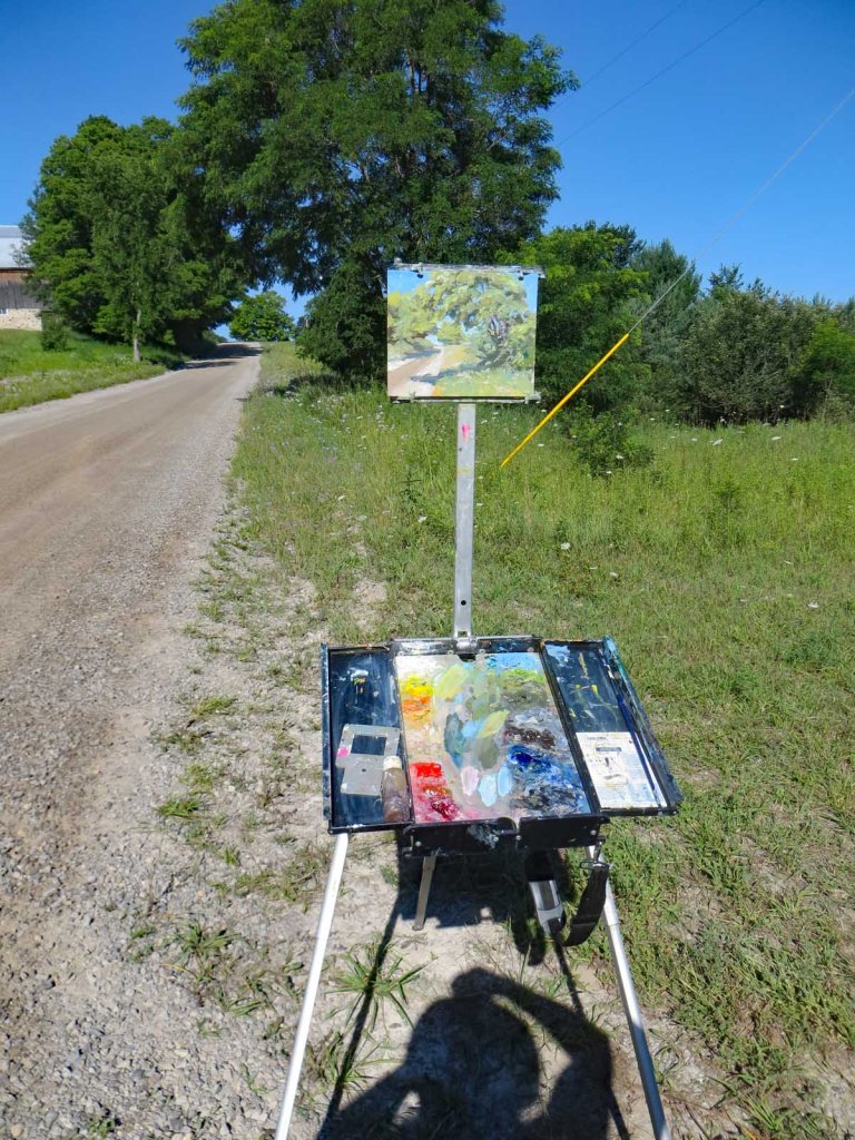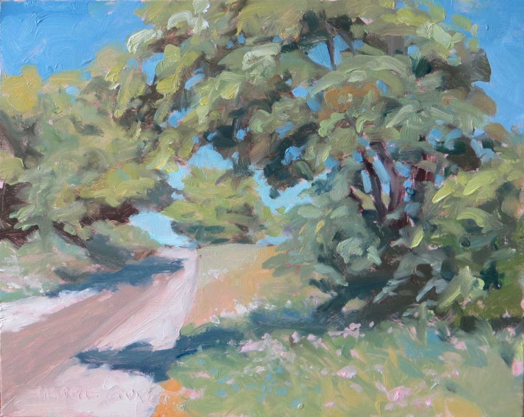 Hanging paintings on display panels at art fairs is a bitch! Cursing under my breath, trying to push little hanging clips into the unwieldly display panels, my deoderant jumped ship. At last I finished, gathered up bubble-wrap and boxes, then took off like the proverbial bat-out-of Hell. I spied this “tunnel of trees” on Metz Road. I pulled over and set up in front of the truck. Strangely, my sun-blocker umbrella didn’t stop the glare from my windshield. Ach! The vississitudes of the plein air painter!