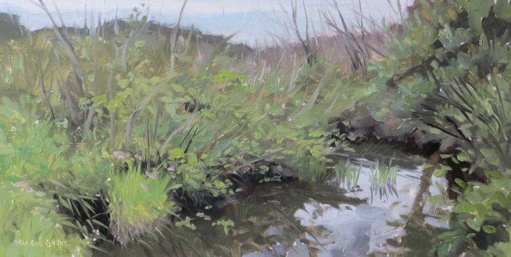 I’m always searching for a “wow” sight. If there’s no initial feeling of “wow”, the painting will always be boring (at least, to me). And I’m always looking for an interesting composition. I loved the shapes of the water and the sky. But – could I pull this one off? The bushes and weeds were just a mad tangle! For the first 15 minutes or so, I thought I’d end up wiping this one off. Added 8/07/20 — This painting won “best of show” in the Glen Arbor Plein Air Paintout this year. Good thing I didn’t wipe it out!