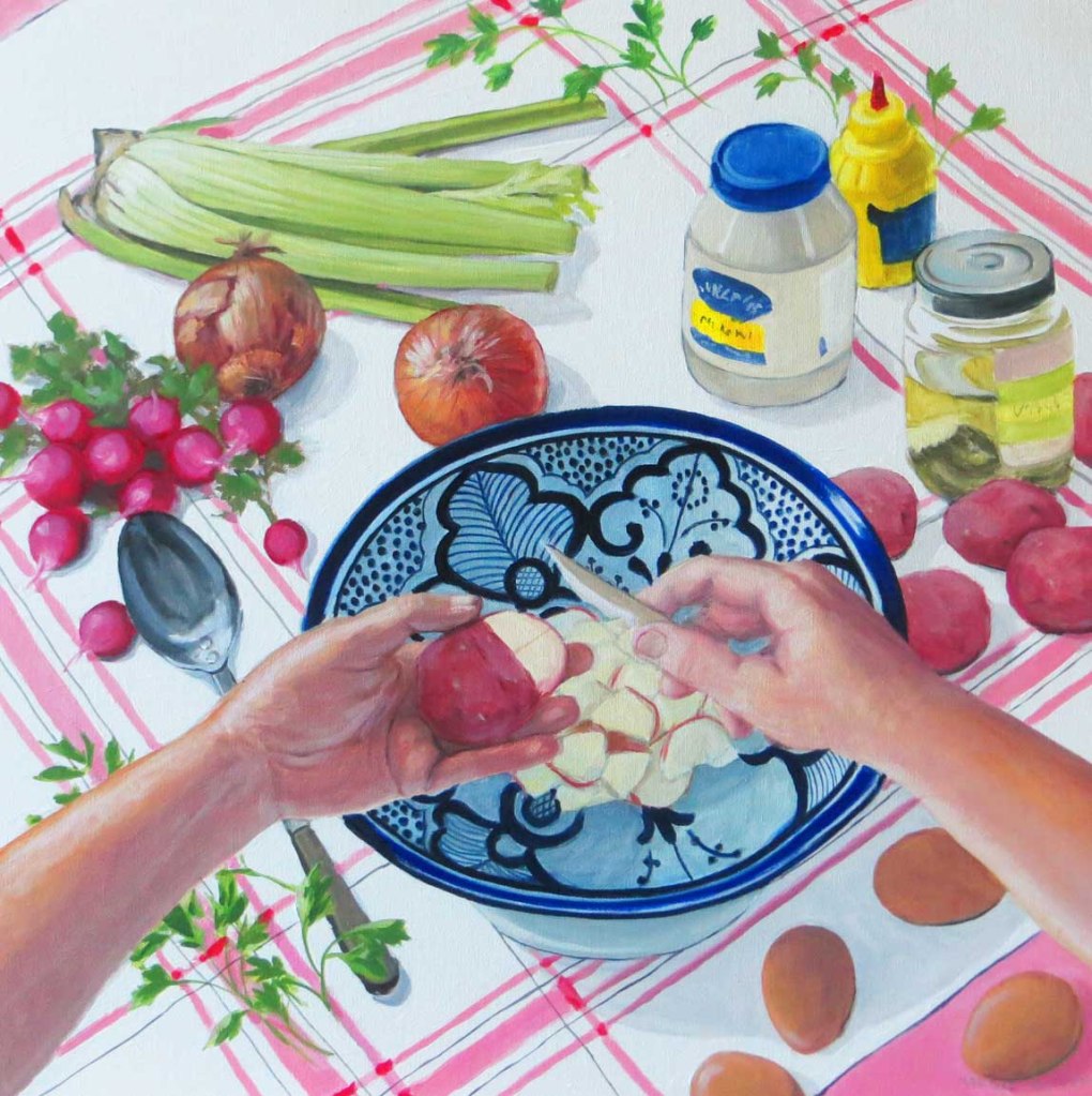 Hands fascinate me. Some people are “into” feet; for me it’s hands. Ideas are swirling around in my head for more paintings with hands. Maybe a whole fantasy-series of potato salad paintings….