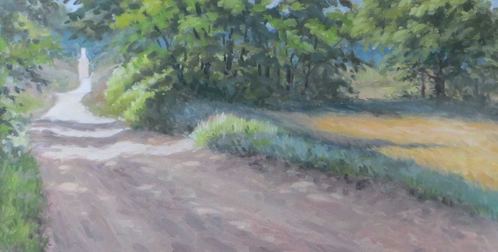 The morning’s quandry: do I tear apart the Toro lawnmower’s carburetor and clean the gunk out — or should I try to paint a slightly larger version of “Ranney Road”? Sitting in a cool studio won out.
