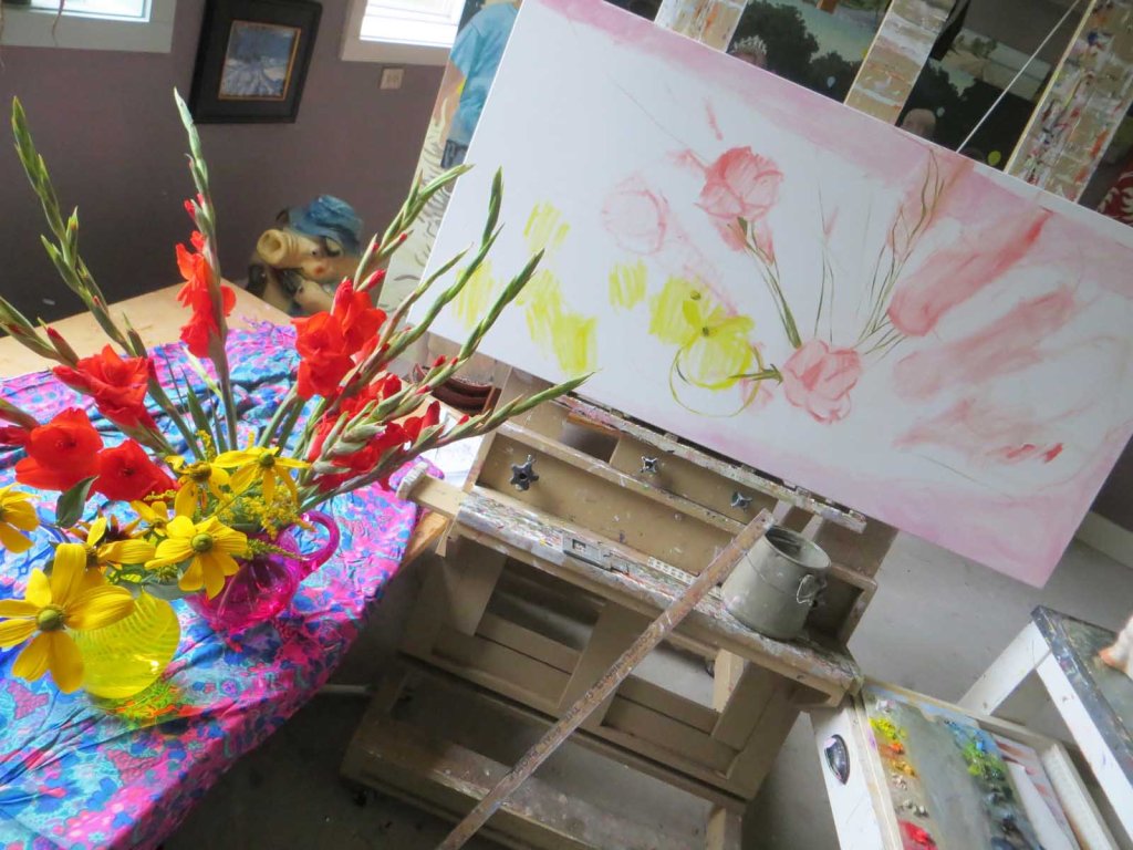 Composition matters a great deal to me. I learned years ago NOT to draw in details first. First “ya gotta position the blobs”. That’s what I’m doing here. Kind of challenging because I’m looking down at the glads and every time I step away and come back, they’re in a different spot.