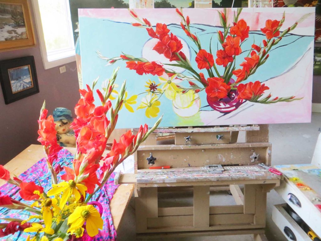 We had a rainy morning, putting a halt on the yardwork, so I had no excuse but to spend most of the day in the studio. A couple floors got washed in the house, but other than that, it was a day for finally nailing down all those gladolias. They’d been blooming-out furiously, as glads do, so I had to invent some of them. It was genuine relief to finish them, so I celebrated by starting to paint in some of the background. It’s all downhill from here.