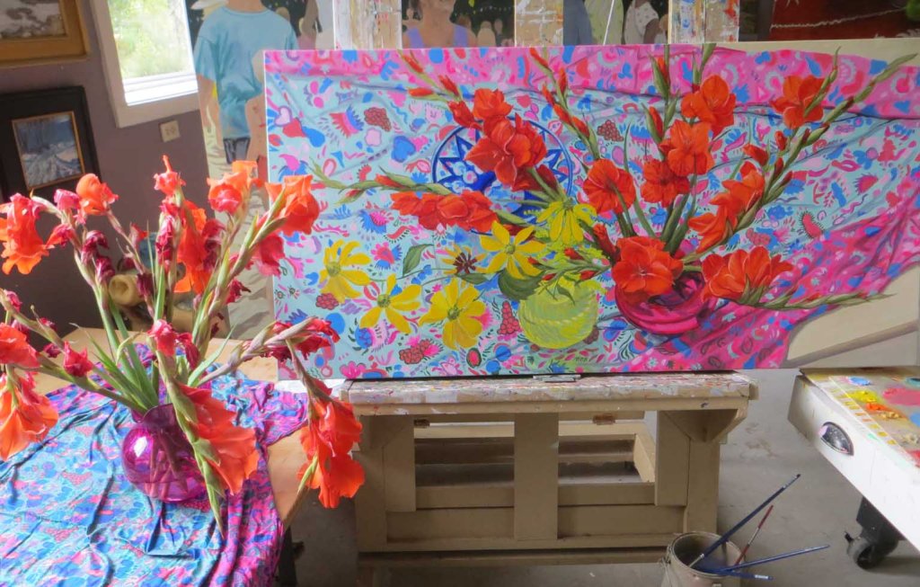 Yes, I could have made things a lot easier for myself if I’d painted the fabric in a solid color. On the one hand, I could almost hear a little voice insisting Keep it simple, Stupid! Ah, but I’m daring. I could never forget what the great wildlife artist, Robert Bateman, told our class. “Never be afraid to experiment. If you try something and it doesn’t work out, then you ruined something that you really weren’t all that happy with anyway.” He proceeded to show our class how he’d mixed a thin glaze of white acrylic paint and poured it all over a painting of an owl. He knew it could have spoiled it, but it turned out wonderful, giving the painting a hint of foggy atmosphere. Here’s his “Fallen Willow – Snowy Owl”:https://artusa.com/image_zoom?image=bateman-fallenwillow-snowyowl.jpg