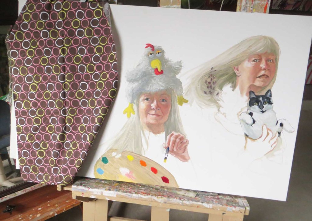 The covered portion hides the first portrait I worked on. It looked so hideous that I had to throw a cloth over it, go outside and start yanking out all the milkweed plants from the flower bed in front of the studio. They were huge. They’d taken over, killing most all the other flowers. They dropped over the path to the studio. Bad feng shui! But don’t worry — I laid them all in the big field towards the road. They’re more than welcome to take over. And then there were the crabgrass roots! It was like trying to dig out a mattress! I worked like a fiend for a week. Finished yesterday.