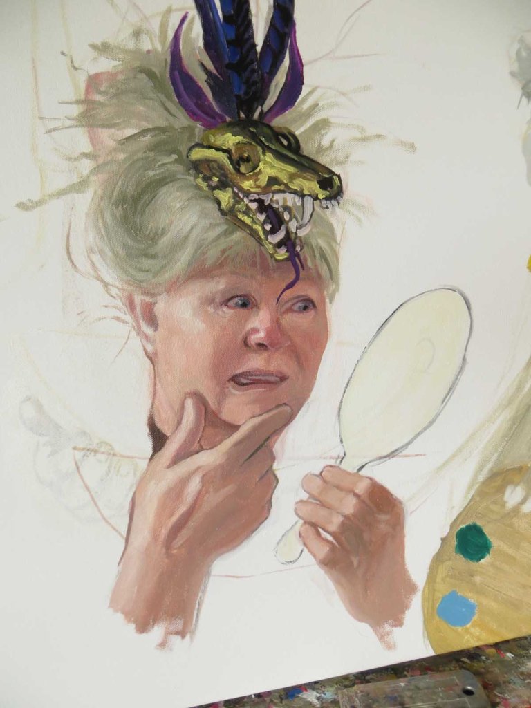 Feeling slightly frustrated, I retreated back to the studio and try to fix my hands. Still need a little revision, but they’re better than before. I also reworked the skull “hat”. Hmmmm….what will today bring?