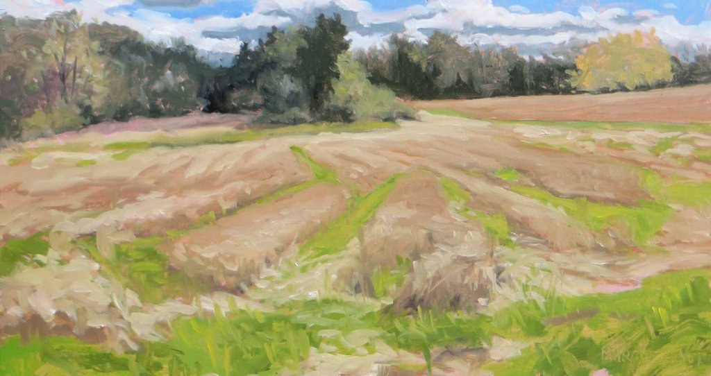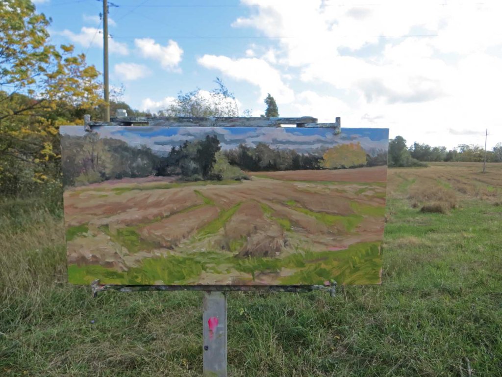 The clouds were so interesting I had to get out to paint this afternoon. And what did I paint? A field, of course! Clouds were secondary. But the wind — ever try to paint a straight horizon line in a strong wind? Hah! This was painted on Bennett Road, about 1 1/2 miles from my house, just off US 31. I love looking at the designs in the plowed fields. And in the fall, the grass has perked up and grows like mad in the most intense green! Yes, I know — I need to tweak that gold tree in the far right. Fighting the wind had worn me out!