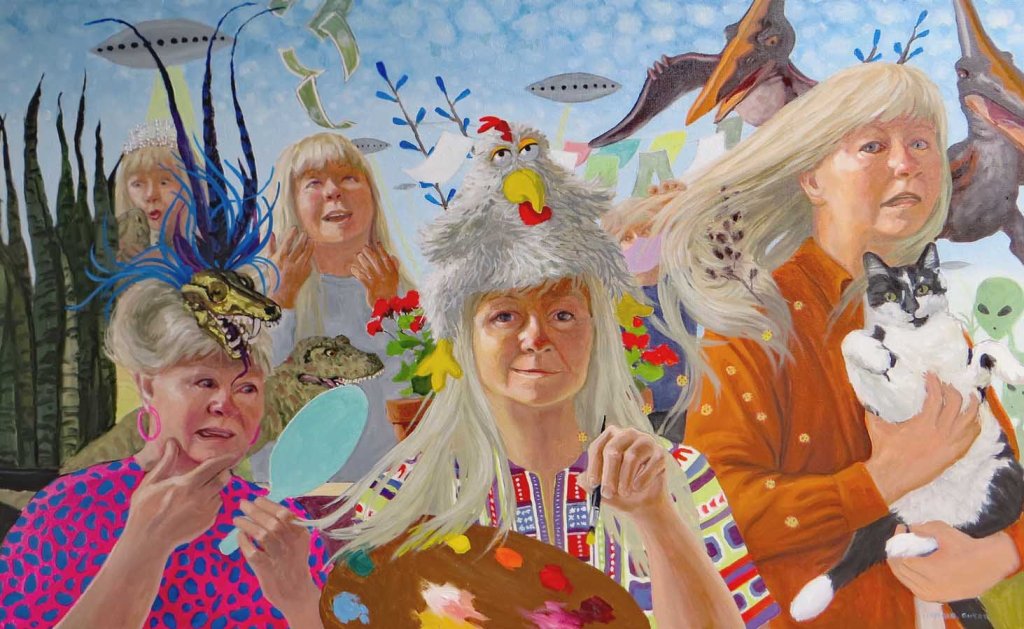 During this Covid social distancing, some people turned to alcohol. Others turned to cookies and ice cream. The ways I have been coping have been gardening — and painting. It’s been a great time to experiment and practice portraits. When I’d hit a snag in the painting, I’d set down my brush and go pull weeds for a few hours. For this painting I dug out a few of my crazy hats and sat in front of a mirror. If nothing else, I got a lot of laughs while doing this!