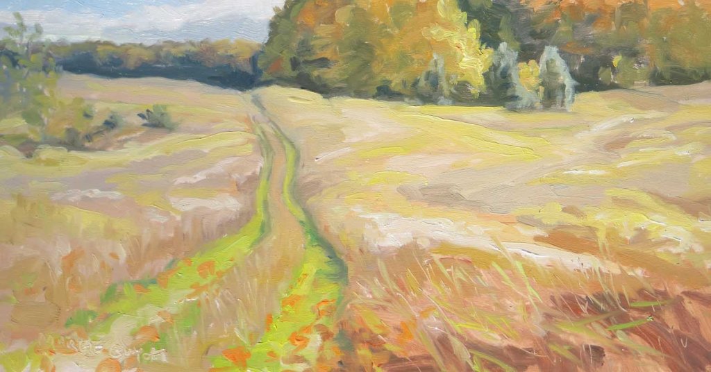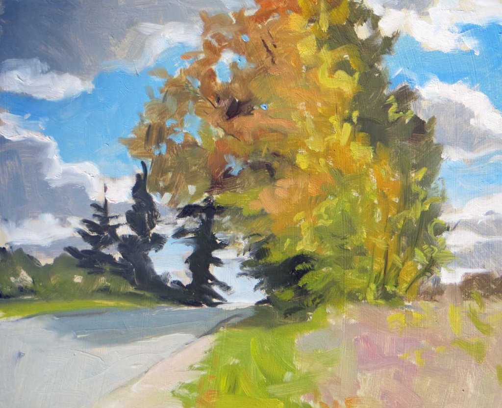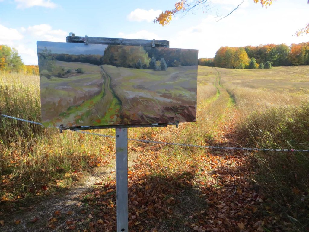 I parked the truck in a little driveway that had a chain with a No Trespassing sign. I set up my easel in the shade of some maple trees. Ordinarily I prefer standing in the shade, but there was a quite a stiff breeze and it was only 55 degrees. Glad I had a jacket with me! I half-expected a cranky farmer to come and confront me, but it was my lucky day. It’s funny how brilliant green the fall grass is! And I loved the patchwork of dried grasses, goldenrod and milkweed. A good day, if somewhat chilly.