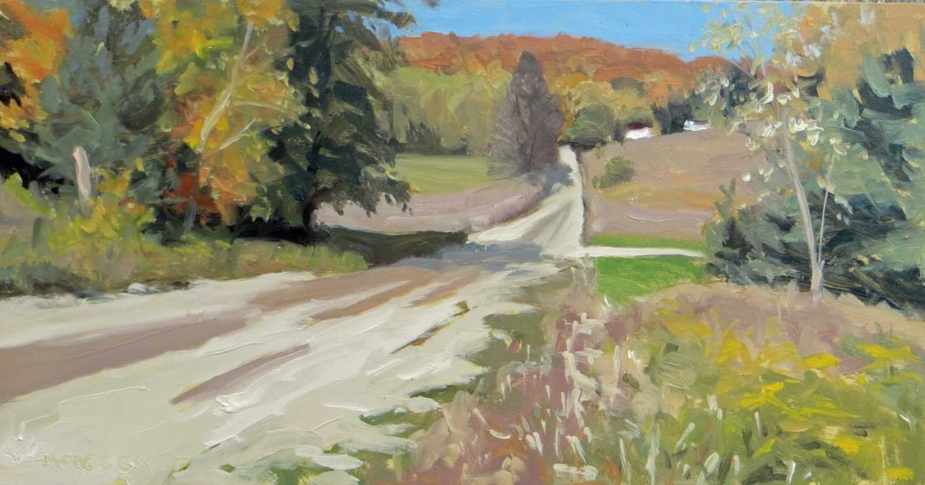 Slough Road starts out as blacktop, then changes to gravel, gradually changing to a narrow, muddy road that winds through deep woods. Lots of seasonal roads back there in the deep maple woods that suddenly stop. Kind of reminds me of “Deliverance” when I go back there….