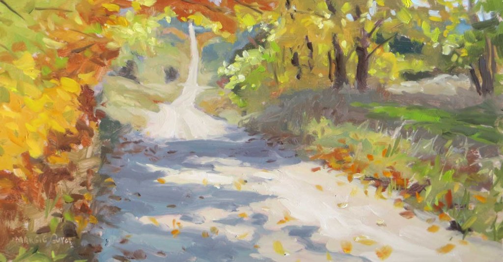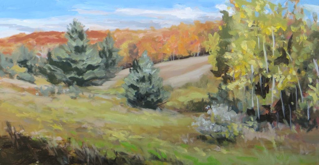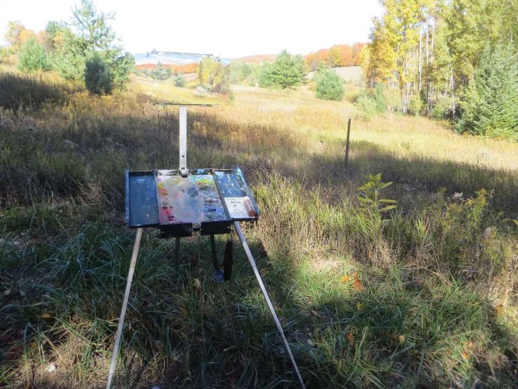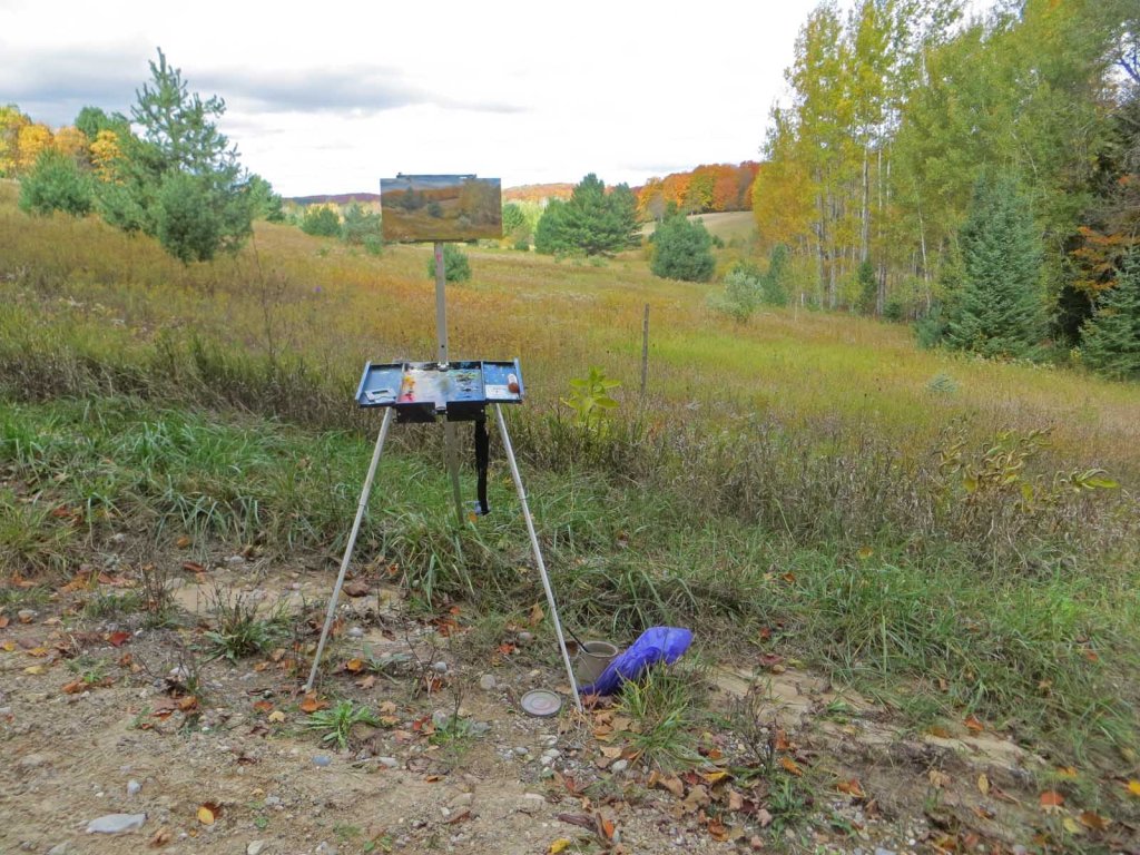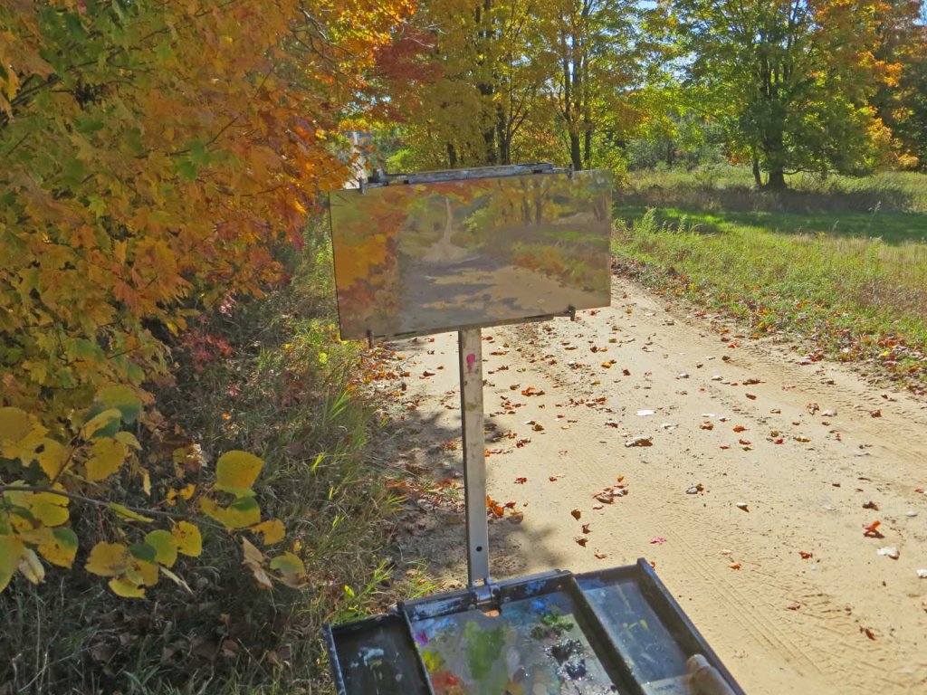 The sky was still blue – amazingly! – so I headed down to a favorite spot, Ranney Road. Back in August I painted this spot. I wanted to see what it looked like in fall colors. I pulled the truck as far off the narrow path as possible, yet it still hung over a tad. Worried that it might be a tight fit if somebody came by, I painted as fast as possible. Nobody came by, of course….