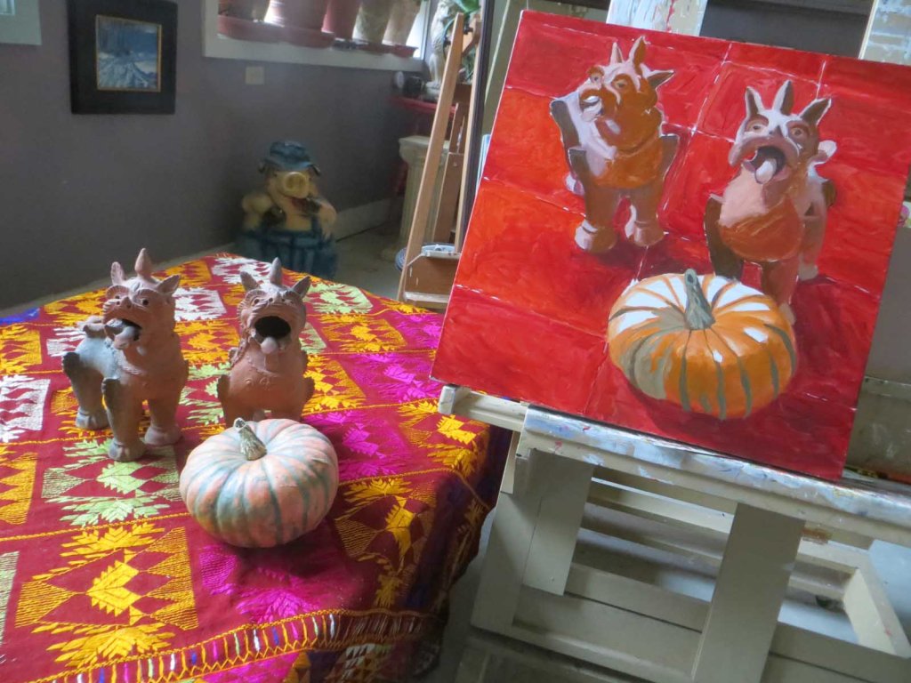 Day 2 — and I really only had about 1 hour to work on this. Some days are crazy. Full of errands, 80 mile round trips, the vicissitudes of life, as an old boyfriend once said. A good friend gave me a “funny” gummy bear to help with a mild back ache. “Take it before bed”, she said. Oh, what the heck: I popped that sucker as soon as I got home and went out to dig the last of the potatoes. We’d had days and days of rain and I just wanted to get ‘er done. It was the most serene potato-digging I’d ever done! And no back pain, thank you. It was so pleasant, taking pauses, stopping to chat with the birdies who were pecking sunflower seeds nearby. And I did make it into the studio briefly to make a stab on filling in some shadow areas. Another artist friend called to chat and was quite amused at my “serene-ness”. Yes, of course this painting is at the “truly hideous” stage. Yes, yes, I know. Just be patient, dear reader! Relax and know that all will be well. Have a gummy bear……