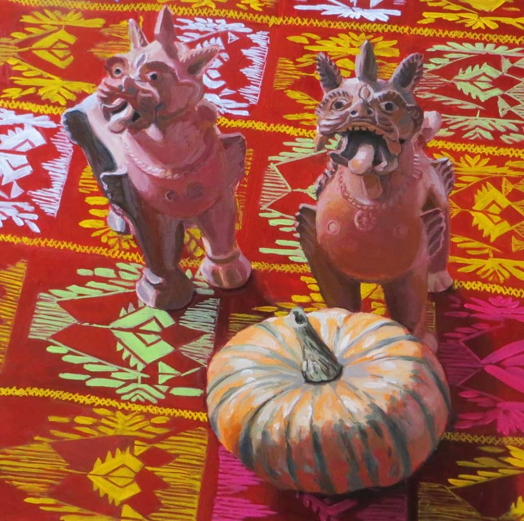 “Foo Dogs” — oil on canvas 20 x 20″ by Margie Guyot