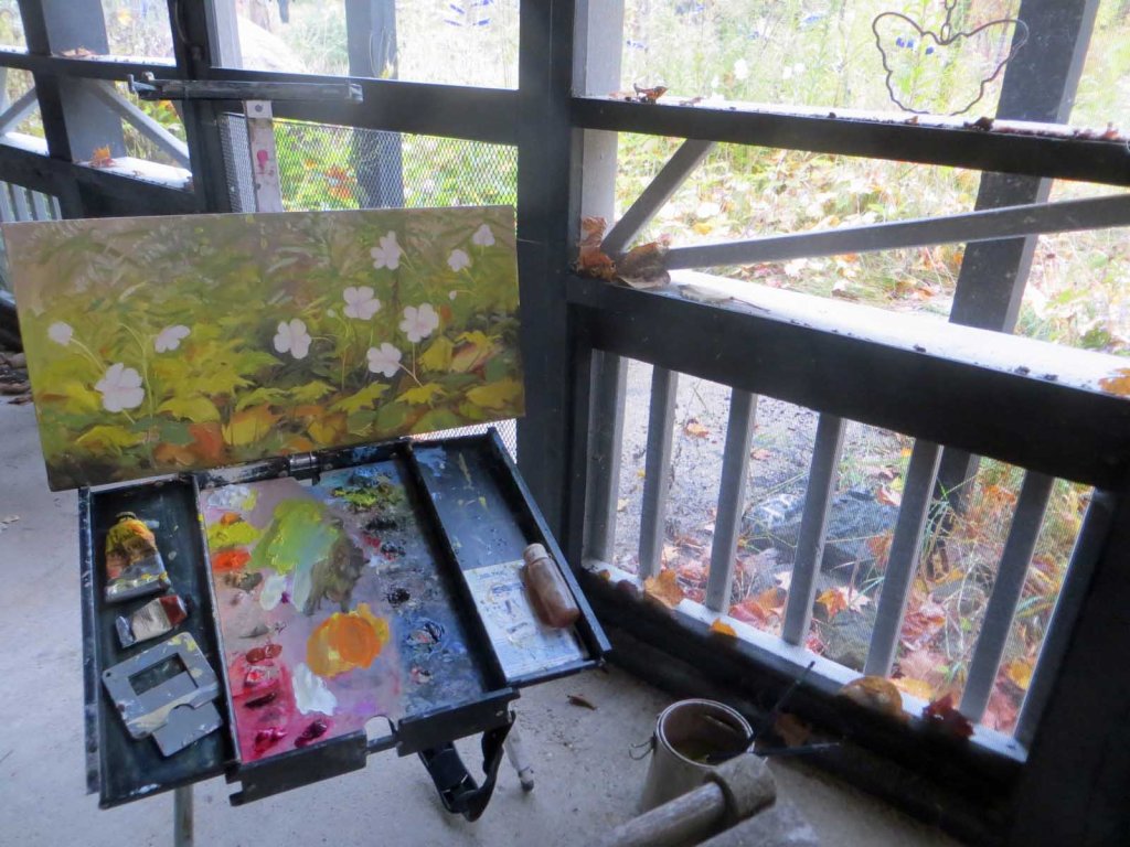 A cold, wet, day here, with occasional bouts of snow. I’d been eyeing this last clump of Japanese anemones and thought it’d be tragic not to paint them. Last week the pink anemones finished blooming; this week it’s the white ones. Bundled up in longjohns, a hand-knit wool sweater and raincoat, I sipped a cup of coffee as I plein air painted this view from the porch.