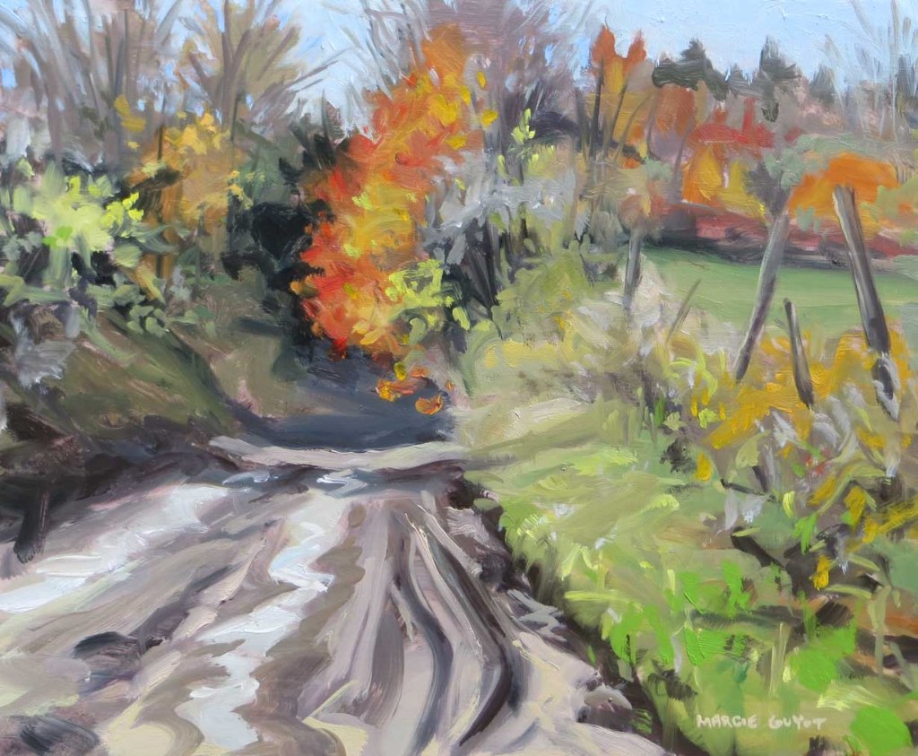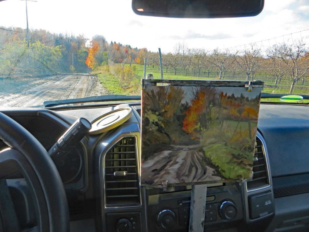 Roberts Road is another seasonal road just about 3 miles from my house. Several weeks of rainfall had reduced it to a giant mud-slide. I parked on the side, set up to paint, but had to quit after just a couple minutes and retreat to the comfort of my warm truck. It was about 39 degrees and the wind was howling! I felt so frozen, it was a struggle to fold up the easel and move it into the truck. By the end of next winter it’ll seem like a balmy day, but right now it felt downright crippling.