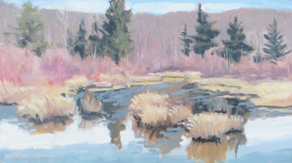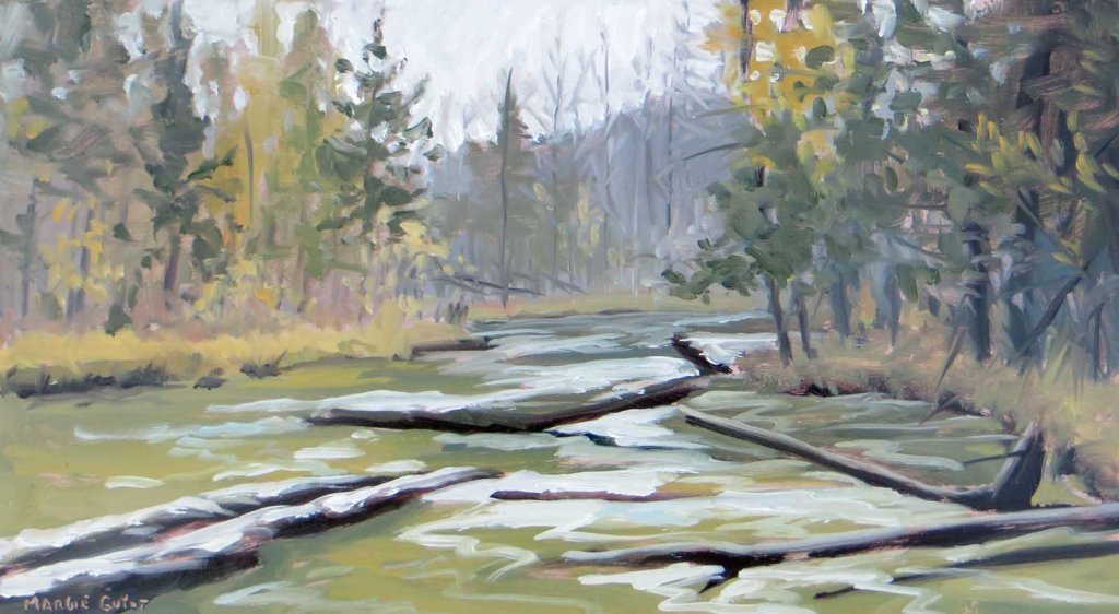 My friend Melanie Swords invited me to join her on a wild plein air adventure along the Jordan River yesterday. Close as it was to civilization, it was a surprisingly pristine wilderness. It was like something you’d expect to see up in Alaska. Here we are at our first stop. We could hear trout jumping as we painted.