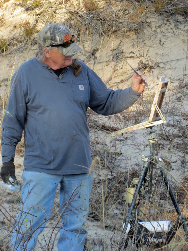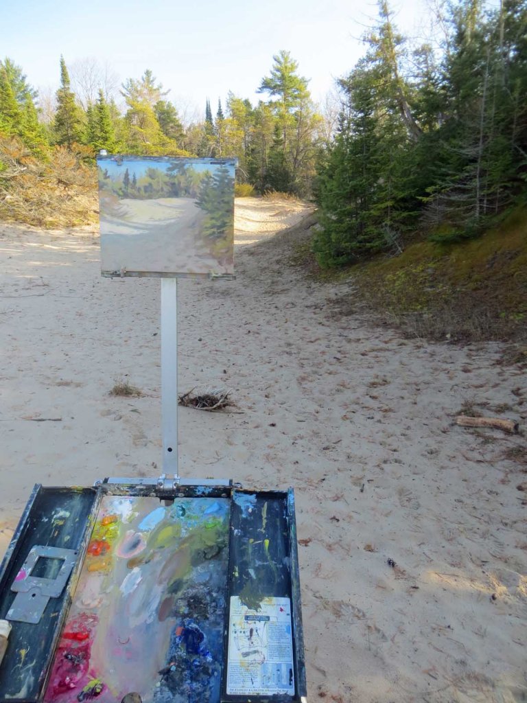It was too nice of a day to waste! I called my friend Cal Kemppainen to join me painting down at Antrim Creek. We slogged around through the sand, lugging our heavy gear, finally deciding to paint in this spot. To the right is a big patch of pines. It’s amazing how much a stand of trees can block the stiff winds blowing off Lake Michigan.