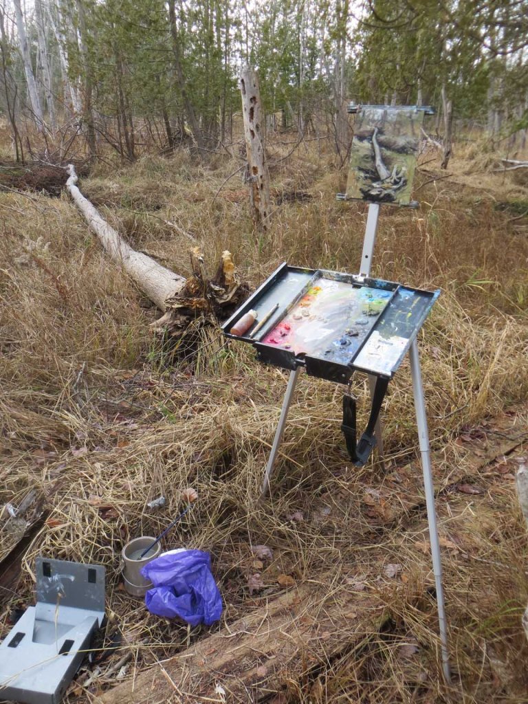 Have you ever been in the mood to go painting — but failed to see anything interesting enough to paint? That was me yesterday. Finally I took a stroll out into the swamp to see how things looked after our last big windstorm. And there it was: a big ash tree had fallen across the creek. Notice how shallow the roots are? We’d had 50 mph winds rip through a week ago and this was one of many trees that toppled over.