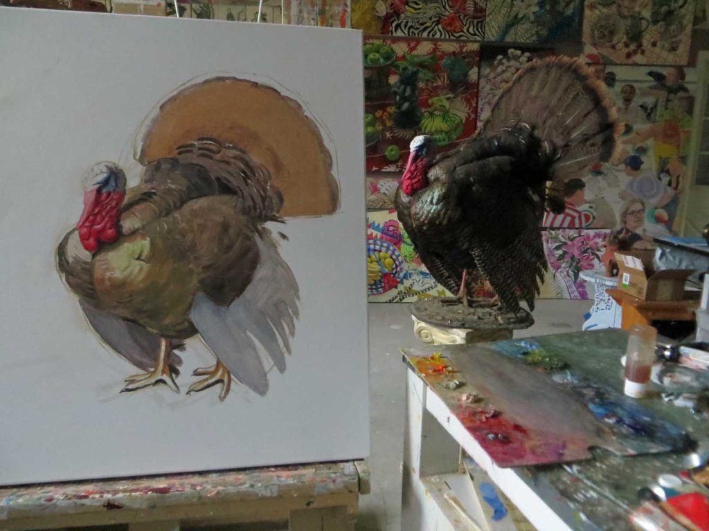 I’d spent the first half of the day running into town, buying a fabulous new shovel, then coming home and transplanting six baby white pines. Recharged by a cup of coffee, I moseyed out to the studio to start a new self-portrait. Ah, patience! I had to block the turkey in first. Stay tuned!