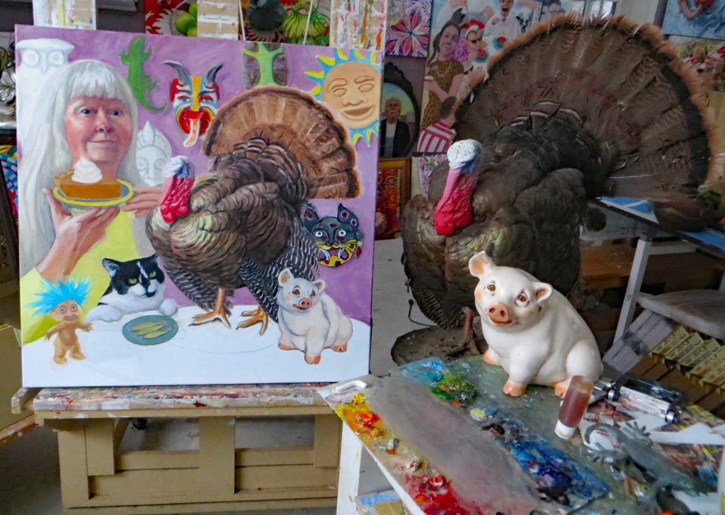 Masks from Peru, Mexico and Africa decorate the entrance to both my house and studio. I love them! They remind me of of fun times in Peru and Mexico. After watching “Frida” a few nights ago, I decided what the heck –– I’m going to go hog-wild and use them in the background. I added a troll doll (it looks quite possessed!) and my favorite pig as well. All reminders of happy times. Piggie always gives me that sweet, sympathetic smile. Much appreciated in this crazy year!