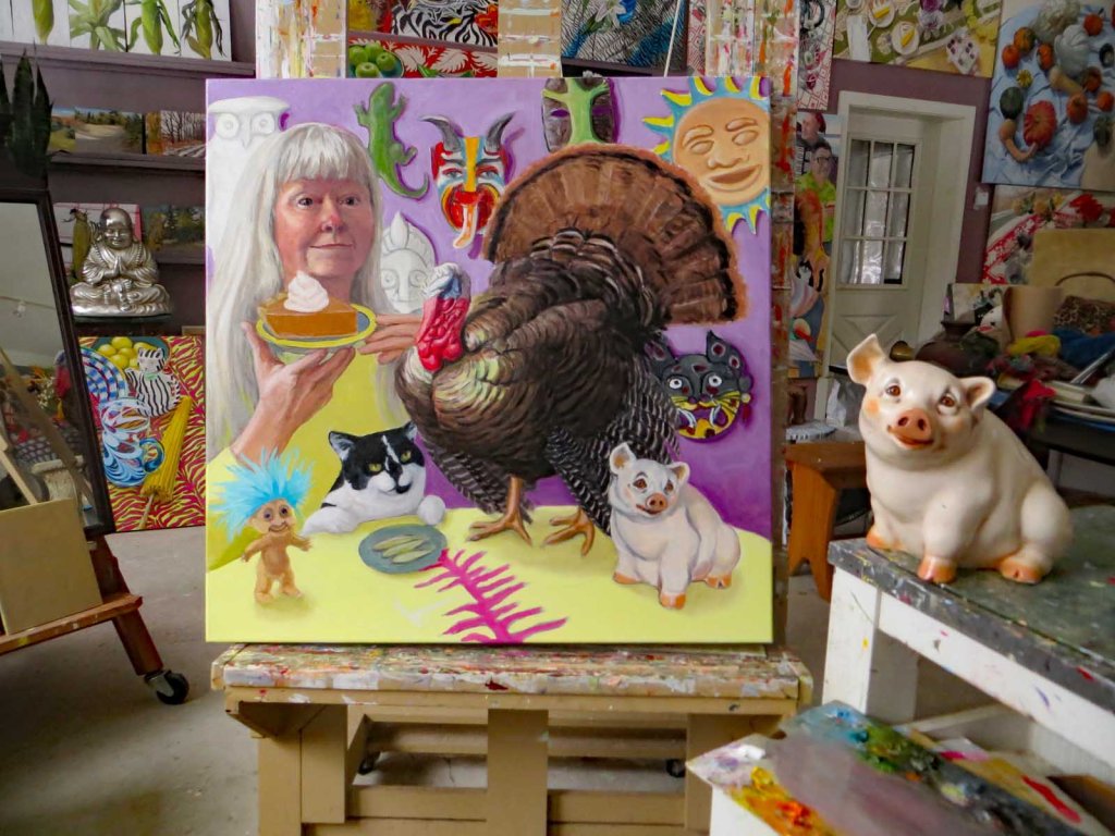 Coming down to the finish line on this, but it’s too gooey to finish today. When dry enough, I’ll be painting the red patterns on the tablecloth. If you look way in the back, there’s a painting with that same fabric. I woke up in bed last night, thinking it would be just the ticket.