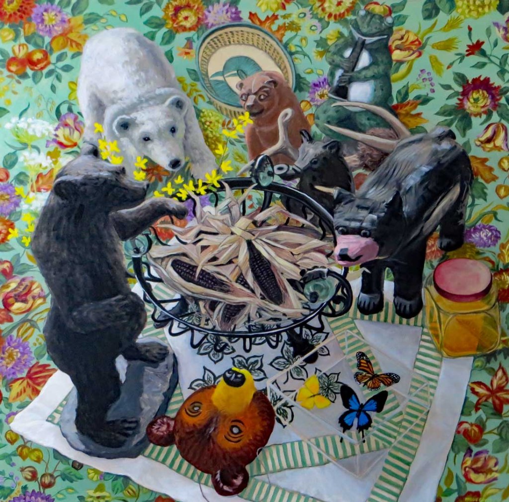 Quite a blizzard going on here today, but it was a fine day to hole up in the studio and finish this painting. Last week I spied the bear mask in an antique store in Elk Rapids. As soon as I saw it, I knew I’d have to do a wild, crazy painting with it. Until I started setting up this painting, I hadn’t realized just how many bears I’d collected over the years. Figured I might as well put them to good use. The floral fabric background gives kind of a cheery, summery feel – and who doesn’t need that now? – but egads –– it was rather tedious to paint. In reality that jar (on the right) was empty. I bought a jar of very expensive honeycomb the other day to see if I could create the illusion of honey in the big jar. Didn’t open the honey jar — it was a whopping $18! I might have to do another painting with it. Maybe a plate of biscuits and honey. And of course I wouldn’t need to actually bake any biscuits — I’ve made enough of them over the years I could almost paint them blind-folded.