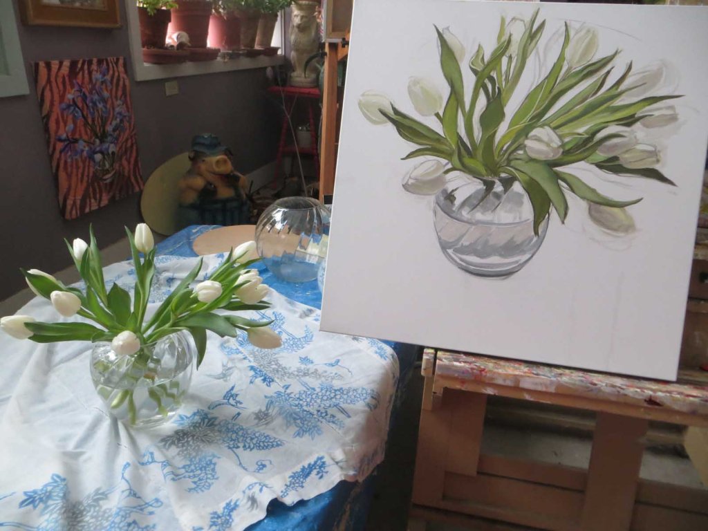After warming up yesterday by doing a plein air painting out in the falling snow — in 11 degrees! — I came into the studio and began this one. Ahhh — there’s nothing like feeling warm — and inspired!