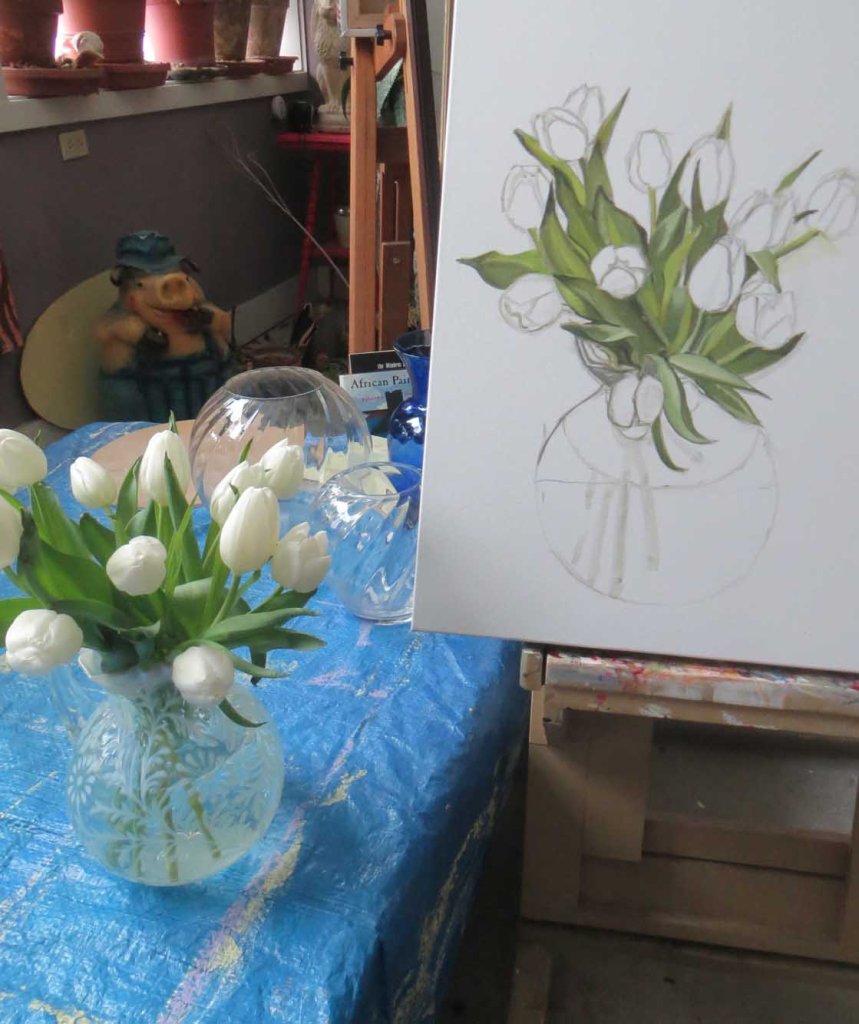 Tulips are wonderful to paint! They’ll hold up fairly well for about a week, so I try to get more than one painting out of them. But they’re tricky. They appear to change before my eyes, growing longer and twist around overnight, so I’ve found it best to get them all drawn in on the first day.