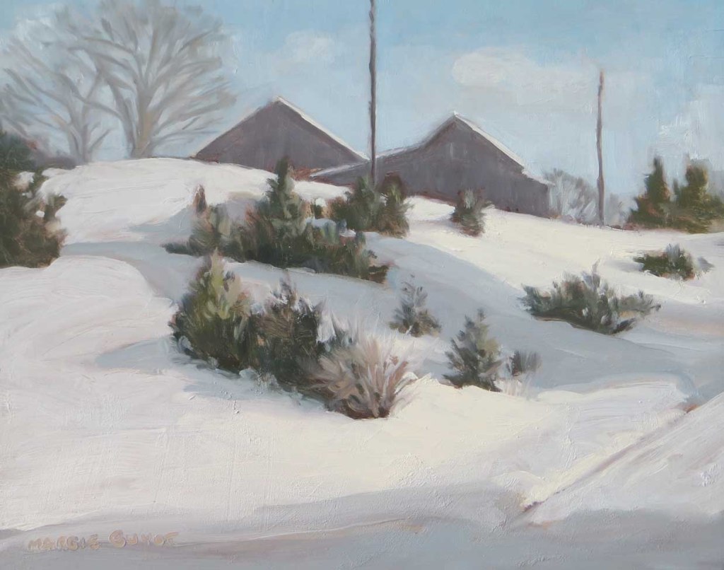 Felt very restless today. I always feel that way after finishing a still life. Kind of hate for the fun to end. And what next? Another winter painting? Still, I wanted to paint something. I do the proverbial running in circles, pacing back & forth, fluttering like a little bird until I get inspiration. Went so far as to sweep the kitchen floor and wipe down the countertops with bleach. Yeah, that bad. Well, I couldn’t figure out if it was going to be sunny or cloudy. Finally I jump-started with a cup of magic elixir (coffee) and decided to drive somewhere – anywhere! – to paint something. Didn’t go far, though. This old farmstead is just down the road from my house, about two-tenths of a mile. Sighing, I pulled over and decided to give it a go. And it was a good thing. By the time I finished, thick clouds had rolled back in. Good-bye blue shadows and sparkling snow!