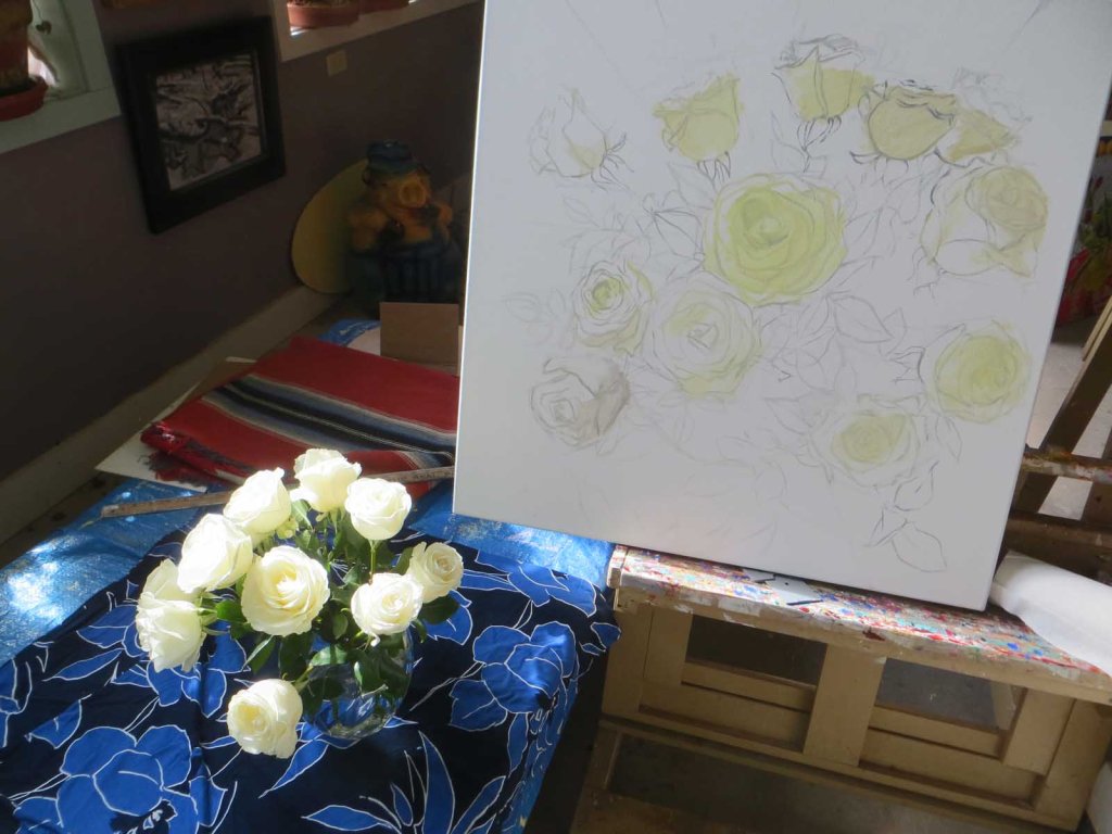 And here’s Mr. Wonderful, taking a painting lesson. The cats have figured out there’s water in those flower vases — and every time my back is turned, they shove the flowers aside and take a drink! The flowers are constantly being rearranged.