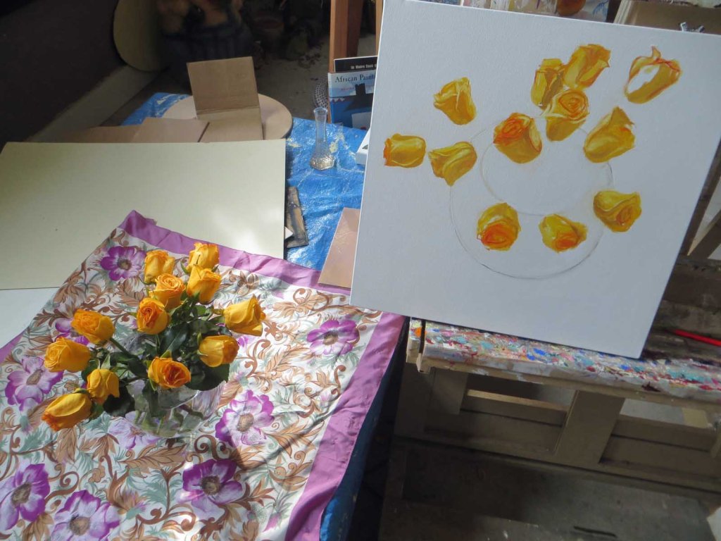 Yesterday afternoon I decided to go ahead and start painting with these poor roses. I bought them a week ago and have cut the stems 4 of 5 times and have changed their water (warm) many times, but they just won’t open any further. Figured I may as well try to paint them before they shrivel up and die. That’s a silk scarf I found in an antique store last weekend. I love painting with lots of contrasting colors, so I think it’s just the ticket.