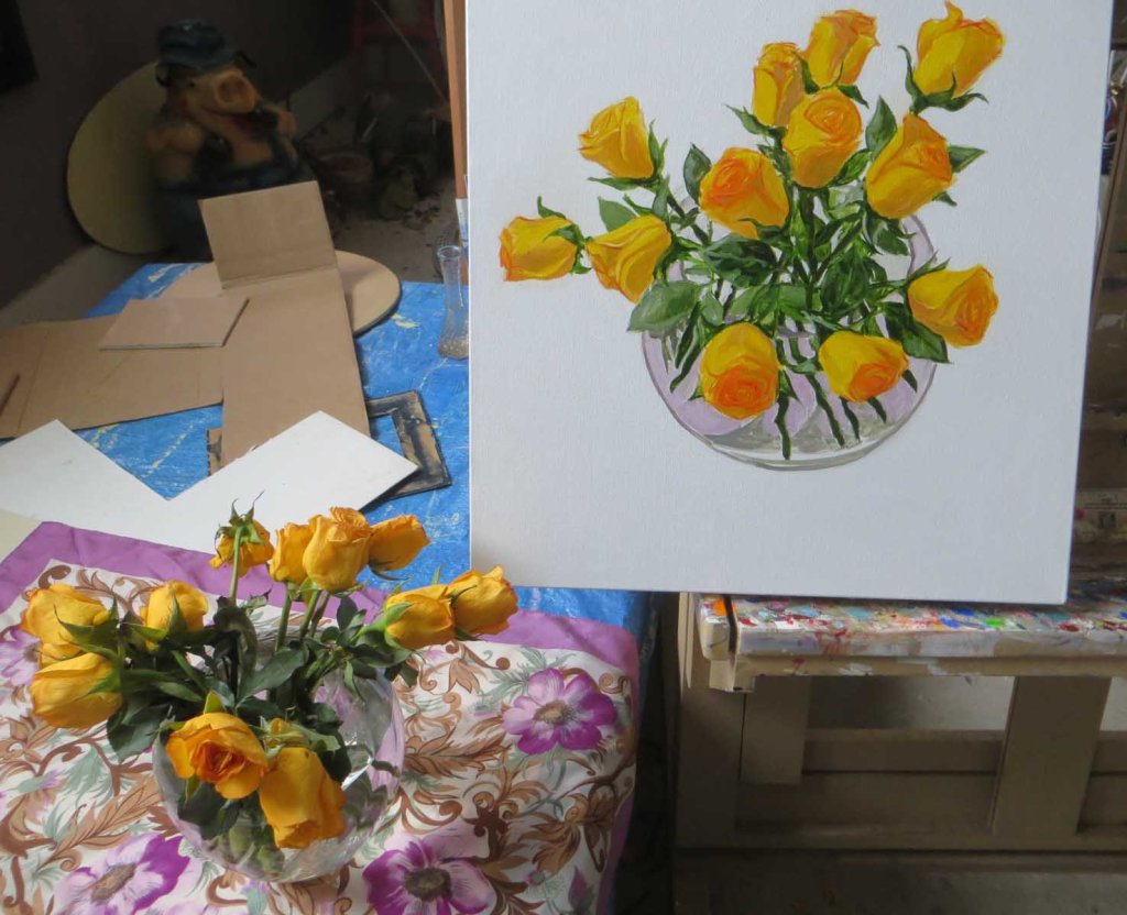 Another busy day schlepping paintings up to Somebody’s Gallery in Petoskey. And prowling my favorite junk shop for treasures. By the time I got home, I was exhausted and felt too pooped to paint. But still… as they always say, the hardest part about painting is getting started. I moseyed out through the snowstorm just to check on things. The roses were dead. It was really too dark to paint. The studio was chilly. Excuses, excuses! Hmmm…. maybe I could try to paint in a few leaves. Even that was a challenge. Only one rose had leaves that weren’t all shriveled and crispy. Sometimes ya gotta just wing it.