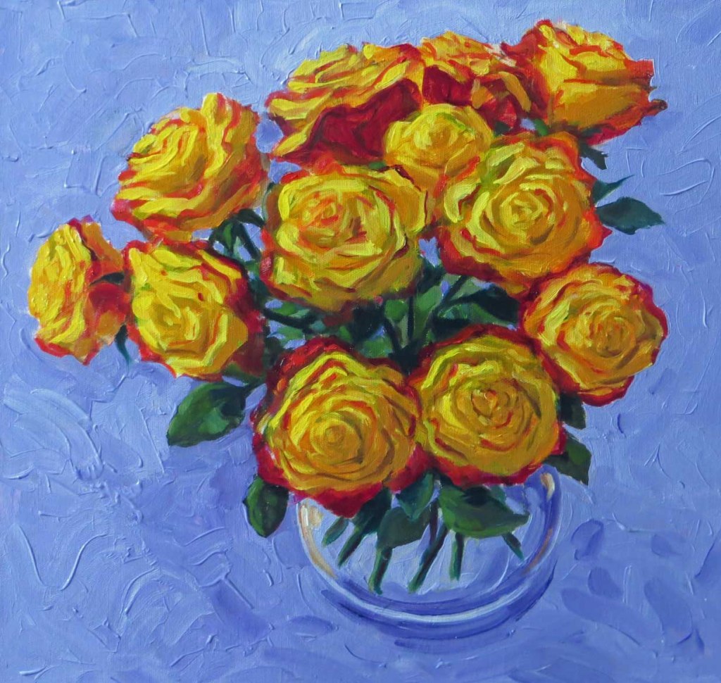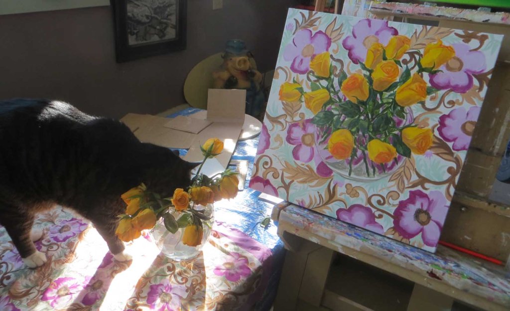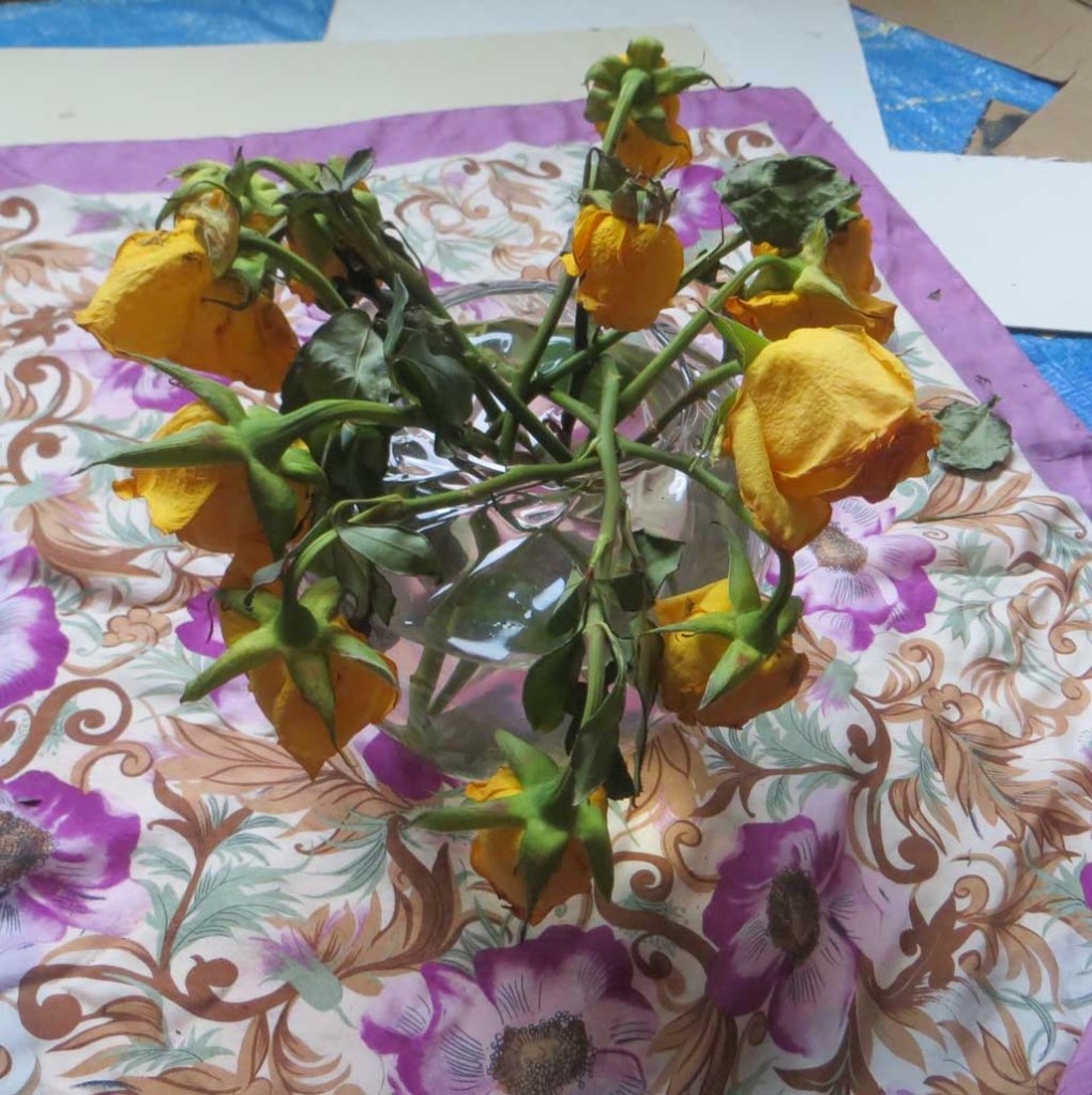 Kind of magic, actually. I’d bought a bunch of yellow roses that refused to open, despite cutting them a number of times and giving fresh, warm water several times a day. I’d begun painting them, hoping they’d eventually unfurl. Here’s how things looked at the end of the first day:
