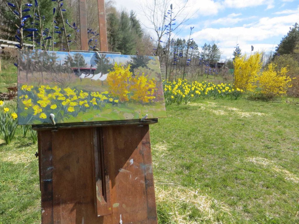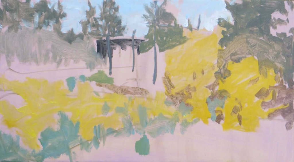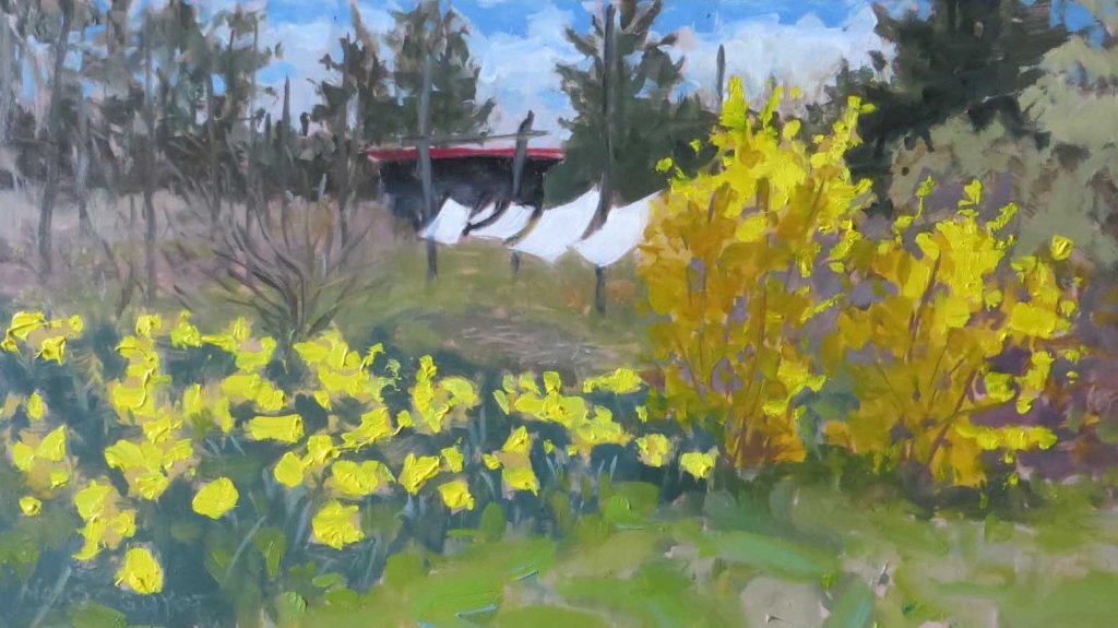 I’d been scurrying around like a madwoman around on Saturday, running hither-thither, doing laundry, gardening, cooking, weeding, etc. Every time I’d go past this view, I’d think I need to paint this! When I finally set up my easel it started to rain (of course!). Then it was a wild rush to take in the laundry and painting gear. Here’s all I had after barely 10 minutes: