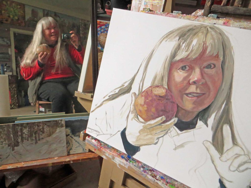 I was SO in the mood for gardening. And/or going out to paint landscapes. But nooooo! We had snow! One-half inch of it. Oh, what to do, what to do? Even my cats were depressed. I was in no mood to drive all the way to Traverse City to grocery-shop. And what should I fix for supper? Then I spied this rutabaga. Aha! So that’s how I spend my day, holding a rutabaga, practicing my portrait-skills. Today looks cold and wet, so it’s back to the studio I go….