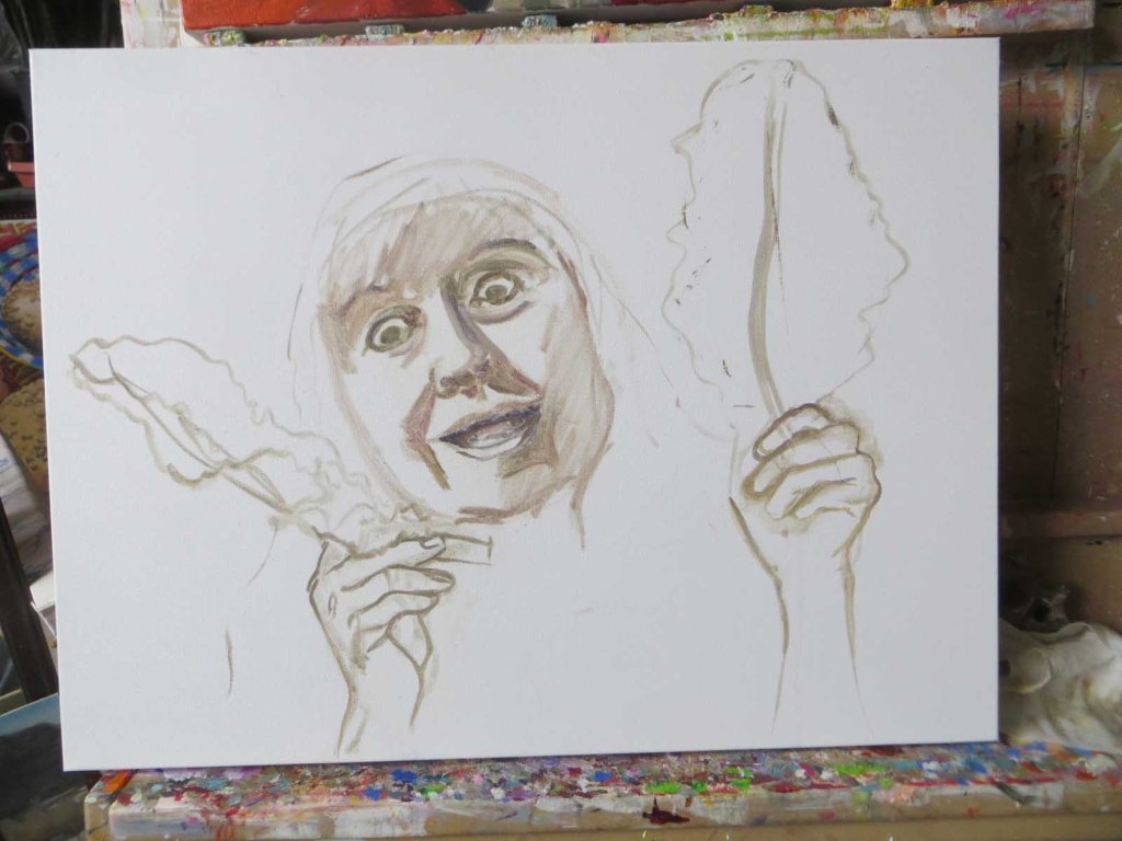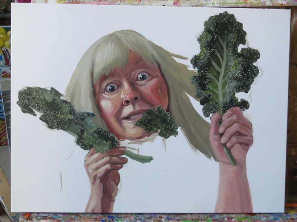 I’m waiting for the background to dry before finishing. This yellow color in the background is not photographing well. Excuses, excuses! In the meantime, I began sketching in another “veggie-themed” painting, having to do with kale.