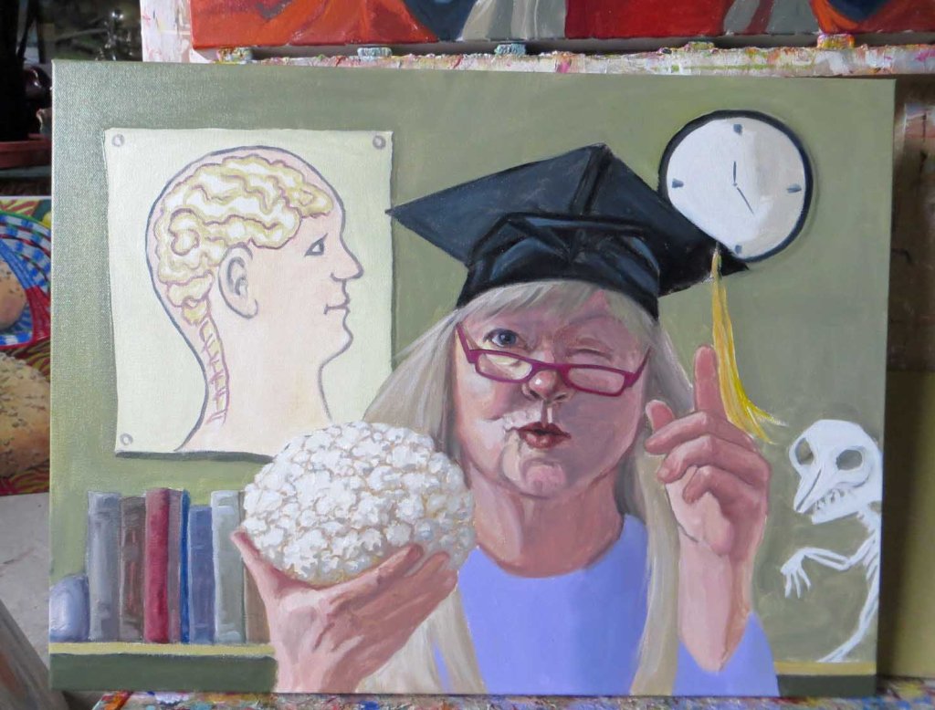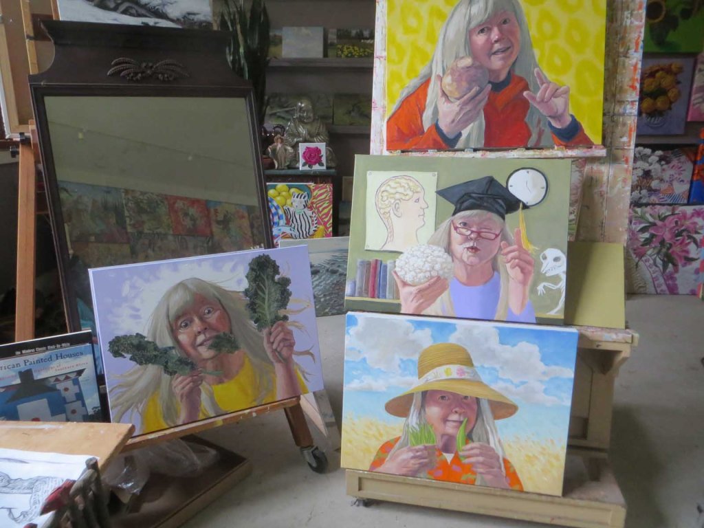 Where to even start? I’ve got 4 studio paintings going, waiting for various things to dry so I can finish. This is the latest in the veggie series. Actually, it’s my excuse for practicing working on painting portraits and hands. Yesterday it looked so horrible I couldn’t post it! But here it is….
