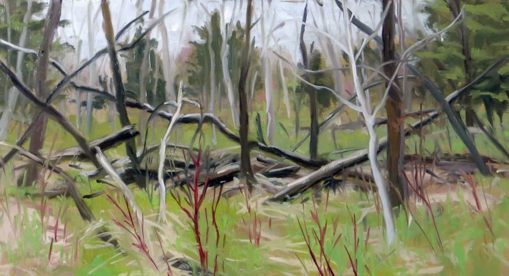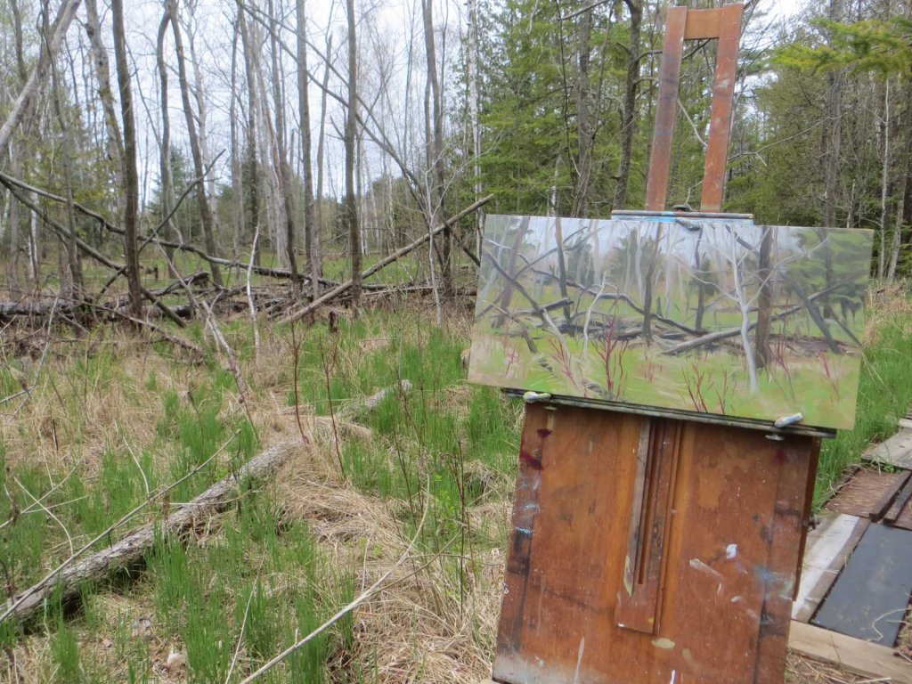 And of course I just had to step out of the studio this afternoon to do a plein air landscape of the view in back of my swamp. Just for fun. Anything to escape the fingers and flesh tones! It was pretty chilly — about 43 degrees and foggy. I wore my heavy down coat, expecting to get rained out at any moment. The view back there is a tangled mess of fallen ash trees. The emerald ash borers have killed all the ash trees. The ash used to soak up all the water but since they died, it’s become a quagmire. I’ve been planting willows and tamaracks, but it’ll probably take years to dry up. Here’s my setup: