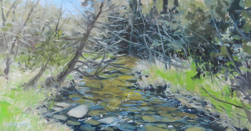 I had to tear myself away from gardening and slavery today to go out for another quickie. I’d meant to paint some of the flowering serviceberry trees, but they were pretty much done blooming. Seems like they all did their blooming on the gloomiest, chilliest days. Cheered by the sunshine and slightly warmer temperatures, I toodled along some of my favorite roads. I’ve always loved this creek but struggled to paint it. I think today’s effort came out fairly decent. I painted as fast as possible because the gnats were out and biting the crap out of me. I never knew the name of this beautiful creek. A Google search revealed it: Ogletree Creek. A little further on it dumps into Toad Lake, which is a little southwest of the bustling city of Ellsworth.