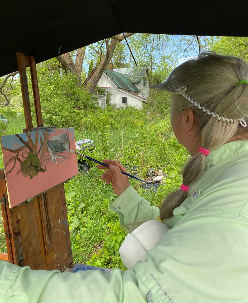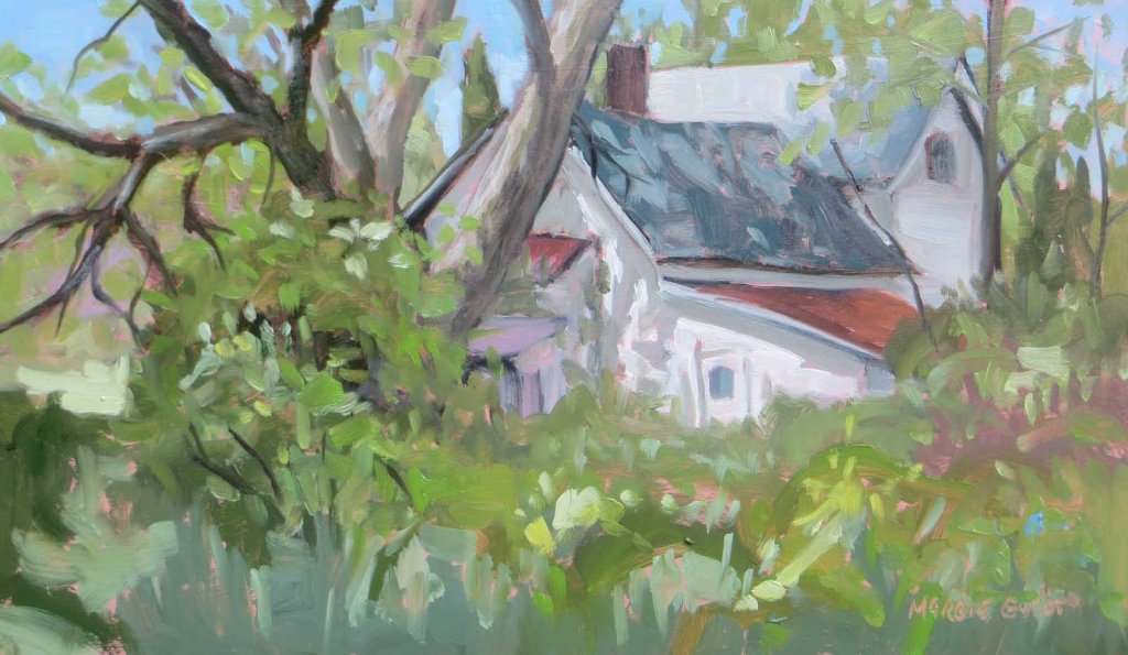 It was 85 degrees, with gusty winds that wanted to rip my shade umbrella into the next county! But I was hell-bent on painting this view of an old farmhouse on Rusty Hart’s land. Oh — and the smell! I forgot the smell. It was next to the sheep barn. Lovely. One of those “suffering-for-art” type of days. Sweaty and stinky. What enchanted me about this place were the gigantic walnut trees, swirling and gnarled in the most magnificent fashion. Rusty’s whole property is a kind of fantasy-land, filled with about a dozen varieties of mint, all kinds of unusual herbs and wildflowers, perfumed by a bounty of lilacs, daffodils, honeysuckle and whatever you could imagine. Truly a place to revisit!
