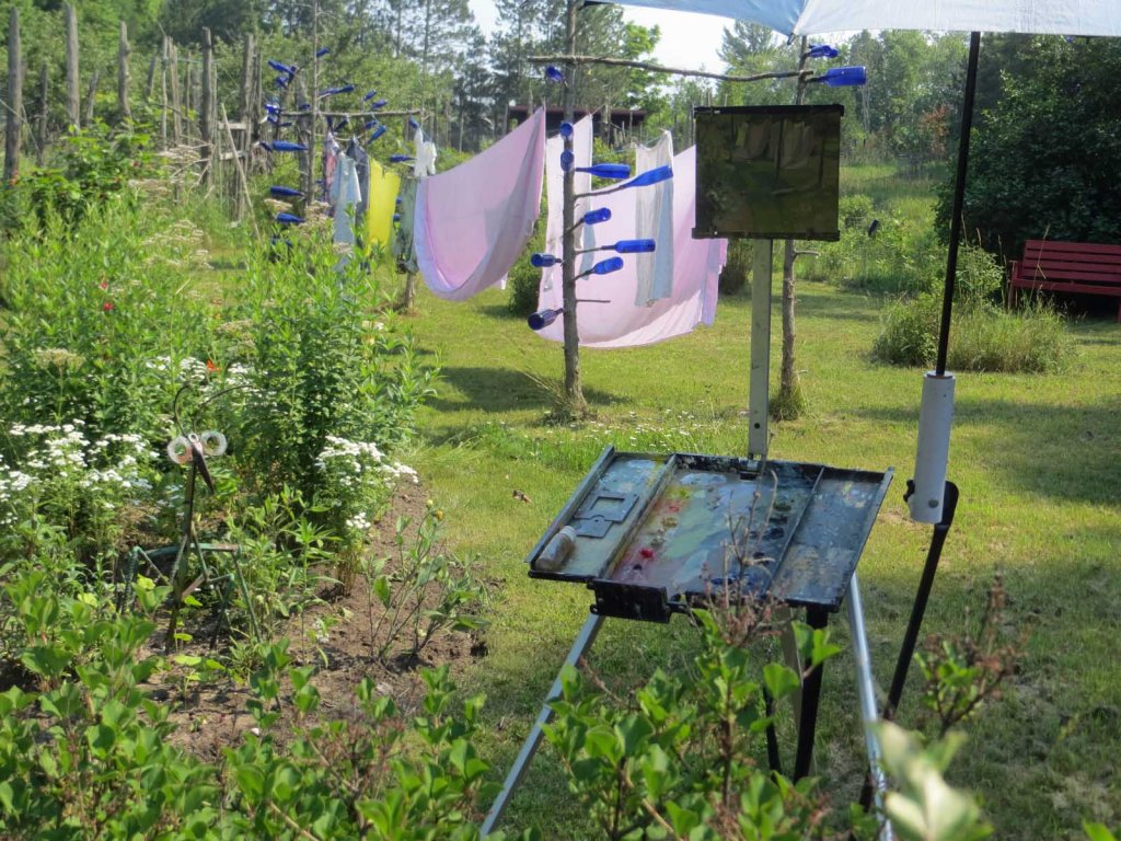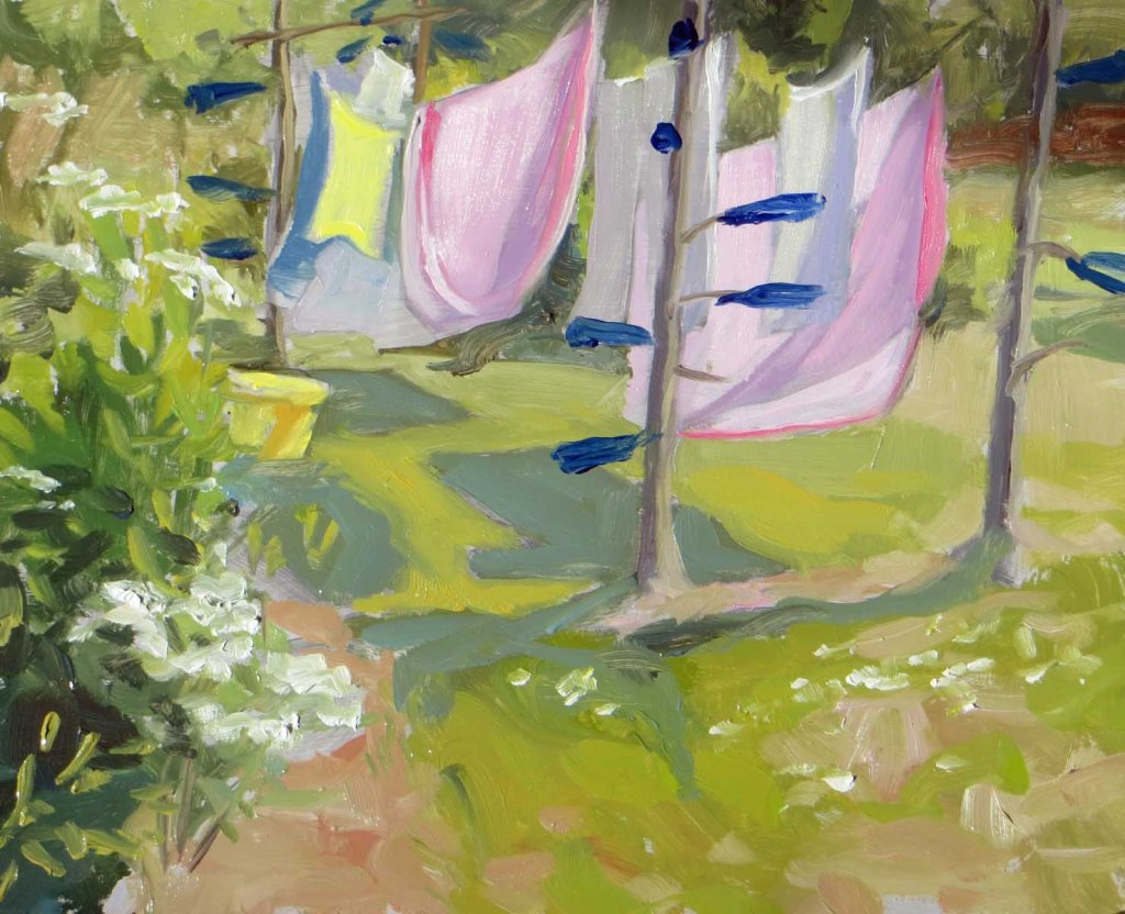 A busy day, filled with all manner of chores. Started the day in the garden, weeding and tying up errant poppies. Did the laundry and hung out on my blue bottle clothesline. Trimmed up a raggedy weeping mulberry and redid the weed barrier, hardware cloth collar, mulched with dead leaves, fertilized, watered and replaced the deer cage around it. At one point I told a friend, “Everything except my face is sore!” Around 3:30 I considered revving up with a cup of coffee, hoping to find the energy to paint this view of my clothesline. No, I’d had enough coffee. Made myself set up and paint. Funny how the act of painting makes one forget every little discomfort. Except for biting flies…..