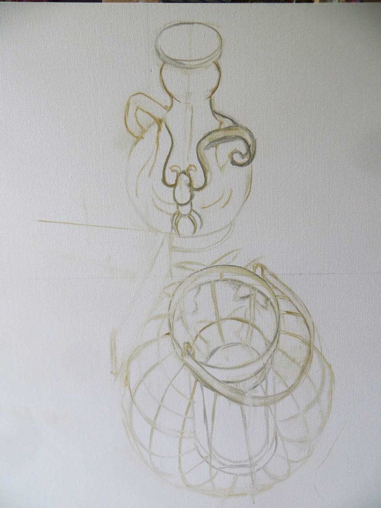 Ah, I don’t know which is harder: setting up a still life — or drawing it in. The actual painting is a piece of cake. I never photograph-project-trace. I’m far too impatient for that routine. No, I rather enjoy the thrill and quiet agony of struggling with the drawing. Kind of like a tight-walker going over Niagara Falls.