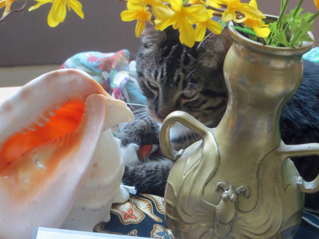What? You missed the cat? Here he is, checking out Momcat from behind the Moth Vase, the original inspiration for this painting. I found it in an antique store in Elk Rapids. Solid brass. I could clobber some intruder real good with that thing.