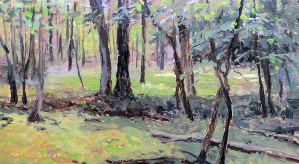 I knew it would be rainy this morning, so I took off for Charlevoix early, hoping for the excitement of a nice, flooded street. Alas, the theme of this paint-out was “Charlevoix Parks”. They gave us maps of the eligible parks. Mt. McSauba seemed the most promising to me as I’m not a big fan of meticulously-groomed grass. It was raining and I was happy to sit inside my truck to paint.