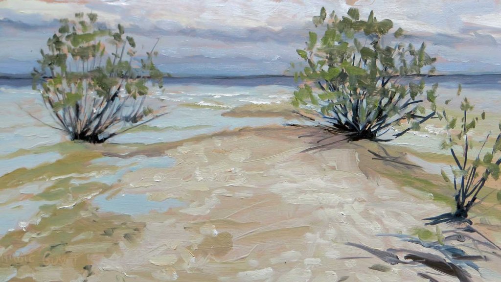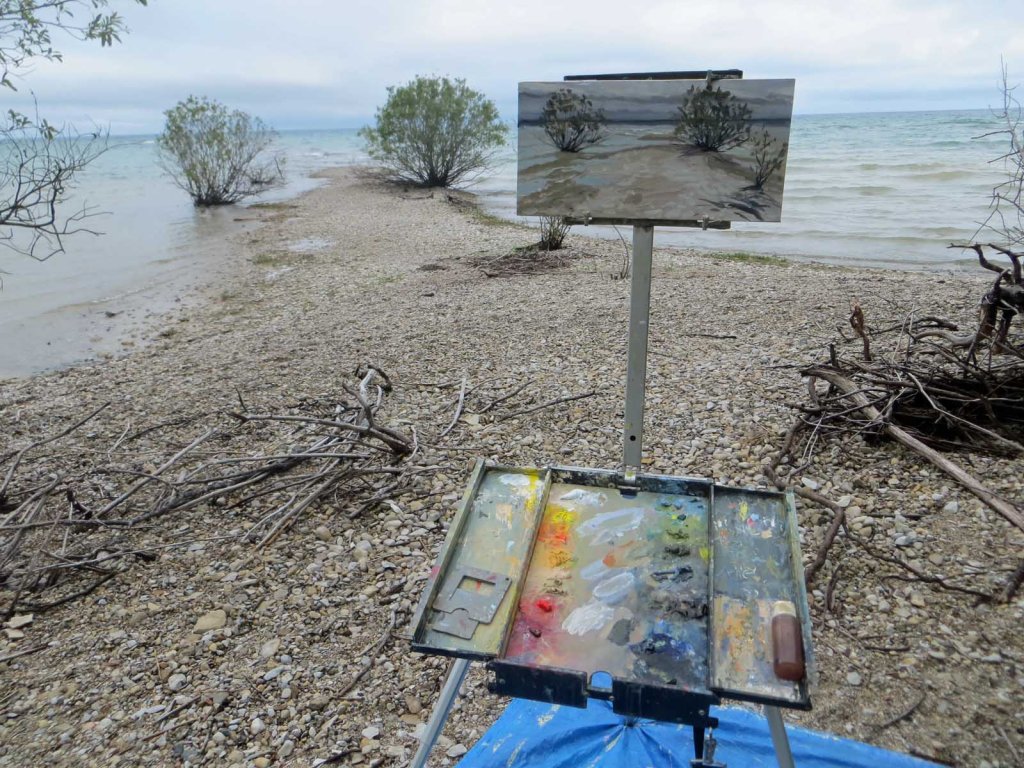 From there I drove over to a spot on the edge of Lake Michigan. A light mist was falling, but I still managed to paint outside, on the beach. Dark clouds in the distance promised more rain, so I painted quick as a bunny.